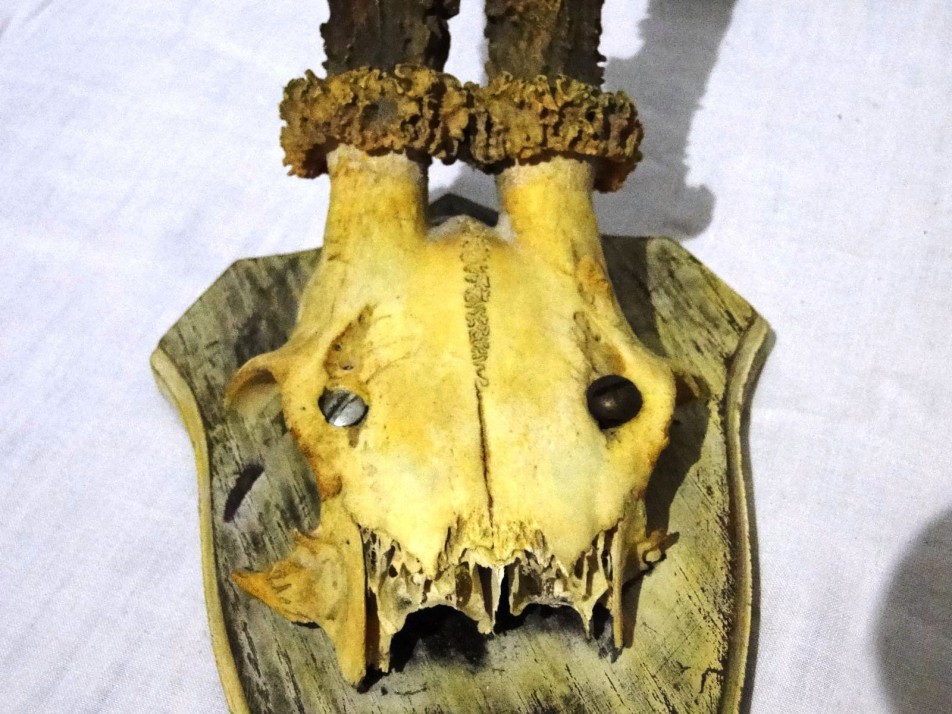 Régi őz trófea , agancs fotón látható állapotban, fa talpon, falra akasztható.