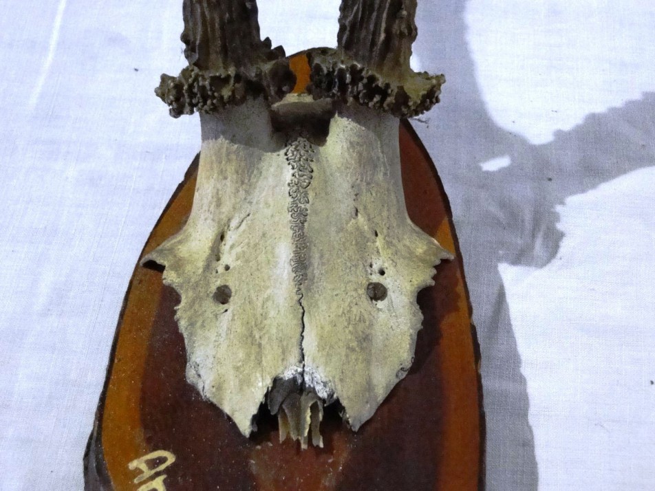 Régi őz trófea , agancs fotón látható állapotban, fa talpon, falra akasztható.