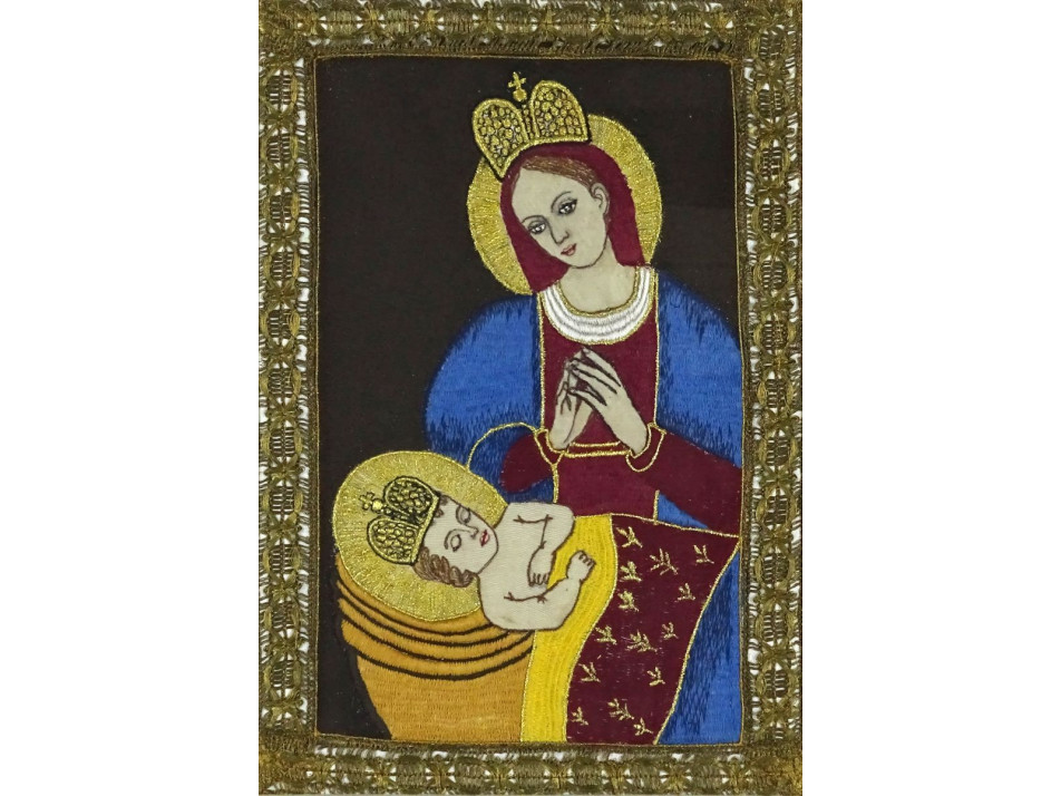 Régi keretezett aranyfonalas részletgazdag kézimunka hímzés. Aranyozott keretben, üveglap mögött található. A győri Könnyező Szűz Mária olajkép utánzata. Akasztási lehetőséggel rendelkezik.