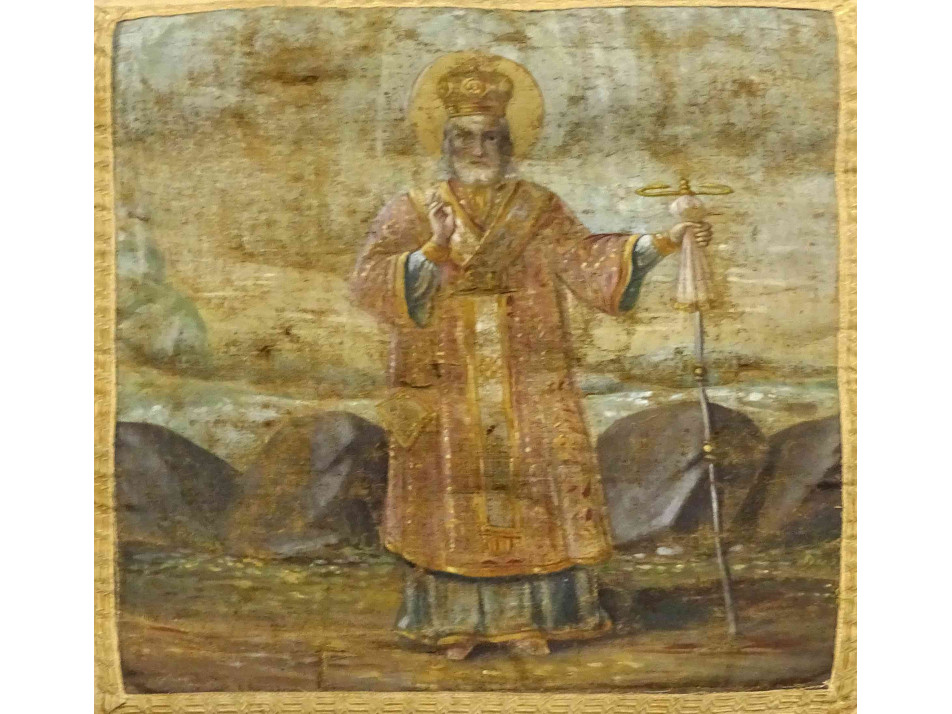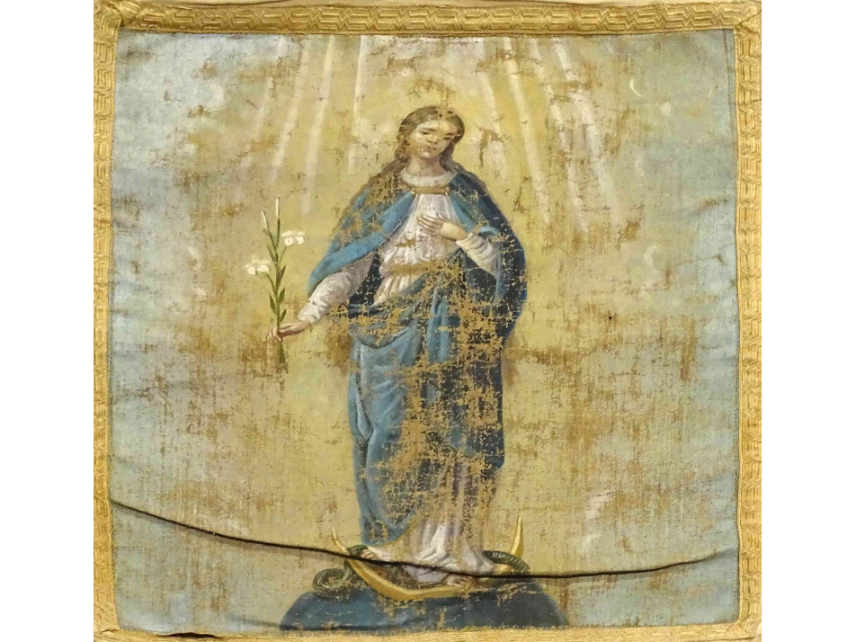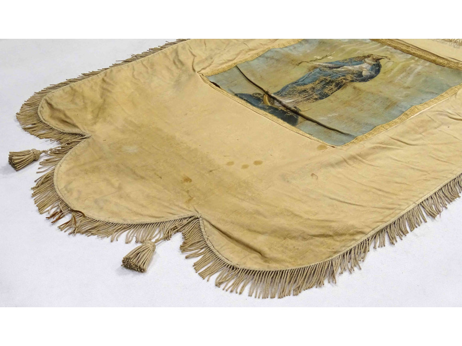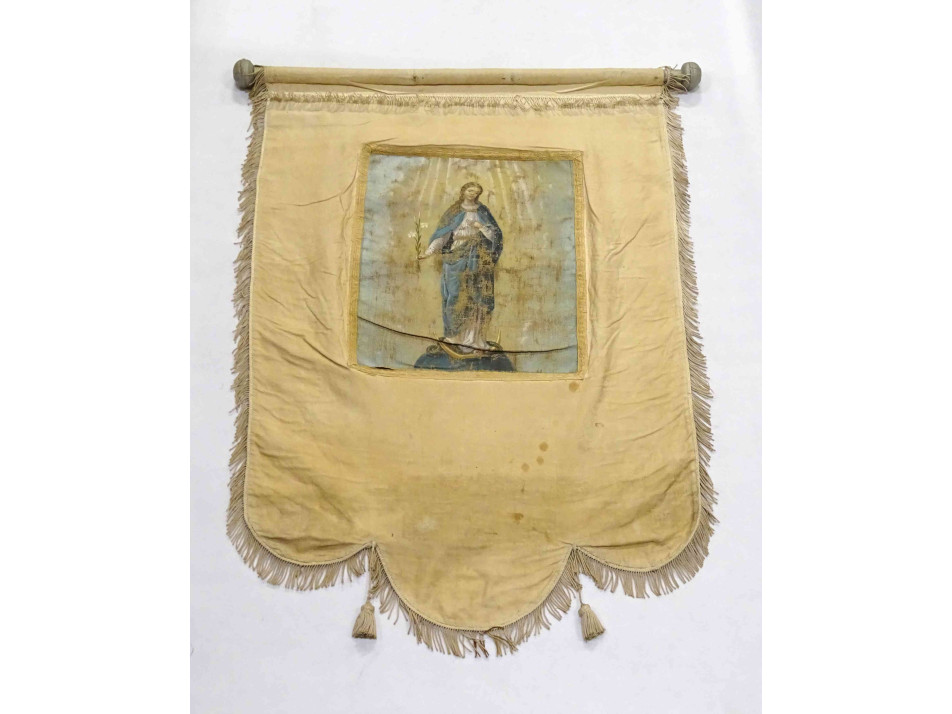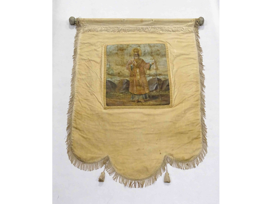 Antik XIX. századi világos templomi körmeneti zászló kétoldalán festett szentképekkel.