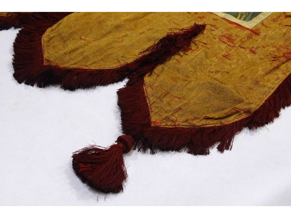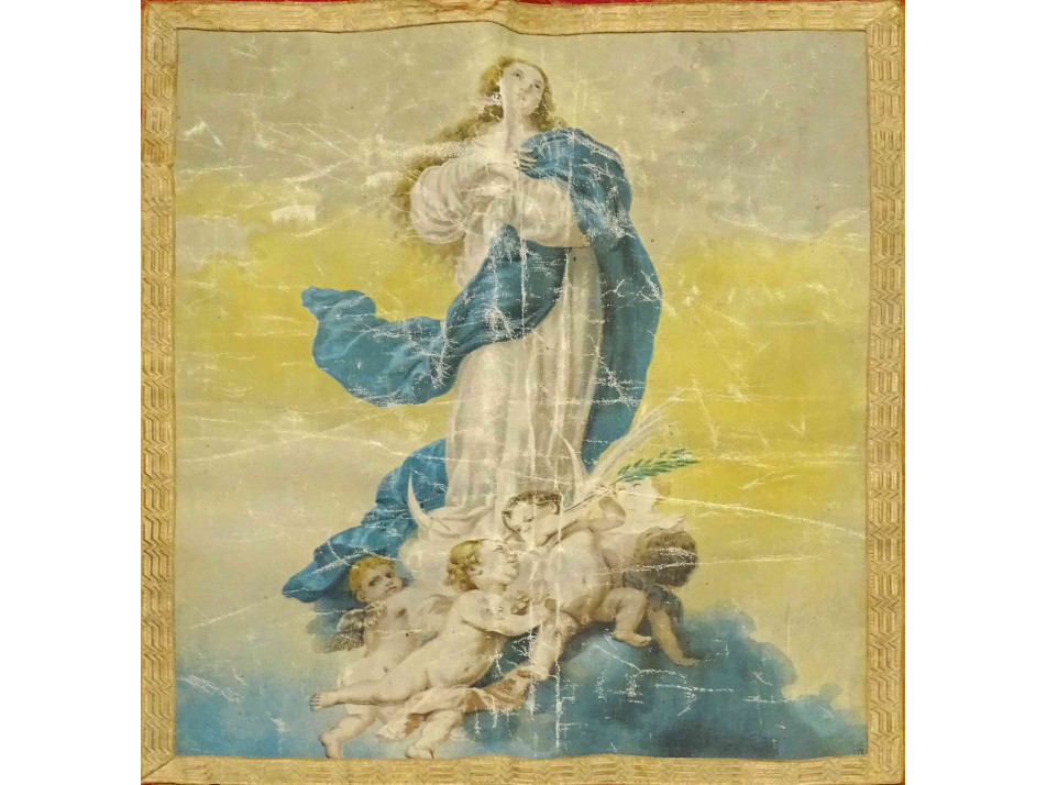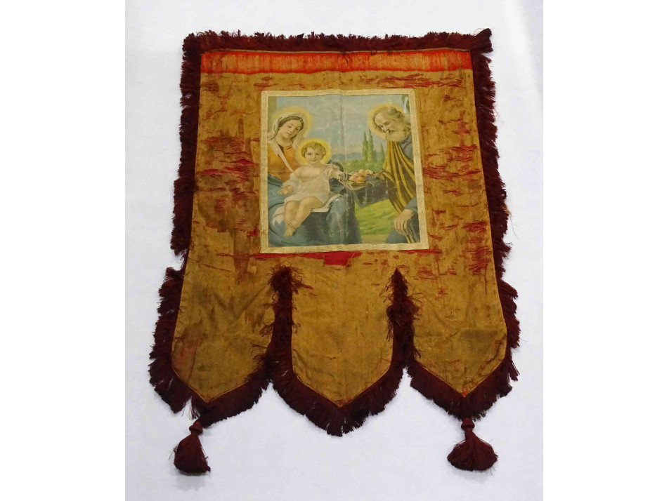 Antik bordó-arany templomi körmeneti zászló kétoldalt festett szentképekkel.