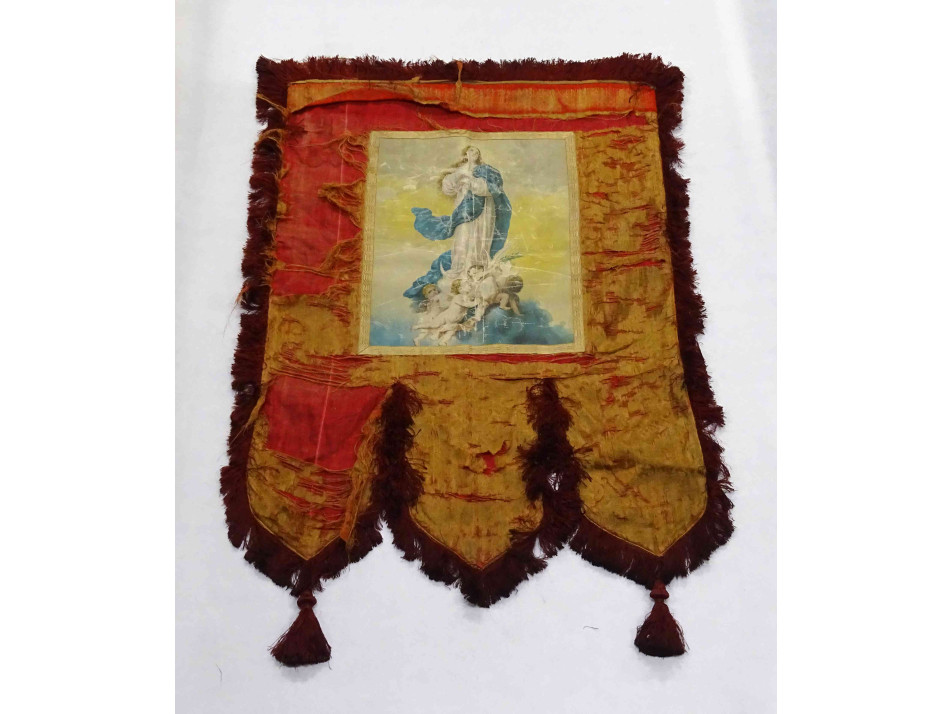 Antik, XIX. századi templomi körmeneti zászló. Mindkét oldalán kézzel festett szentképekkel díszített templomi drapéria. A festmények jó állapotúak, míg maga a zászló anyaga erősen kopott, elfeslett állapotban van. A zászló anyaga bordó - aranyszínű brokát, körben bordó rojtokkal. Zászlórúdja nincs.