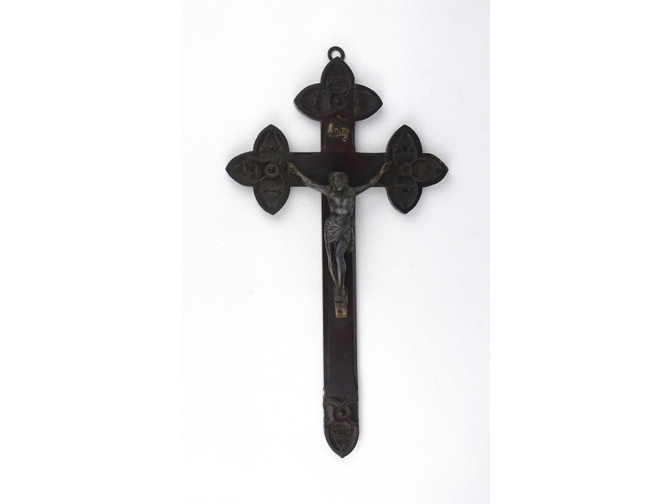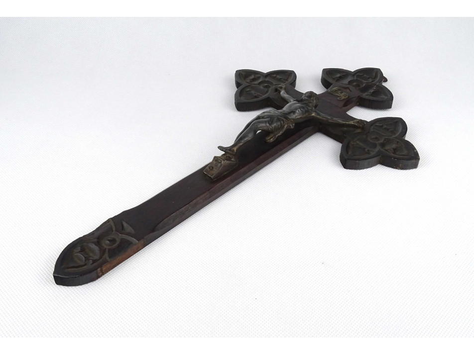 Antik, nagyméretű, gazdagon faragott fa feszület, kereszt, egyházi vallási kegytárgy. A feszületen ezüstözött, részletesen kidolgozott ón Jézus alak található.