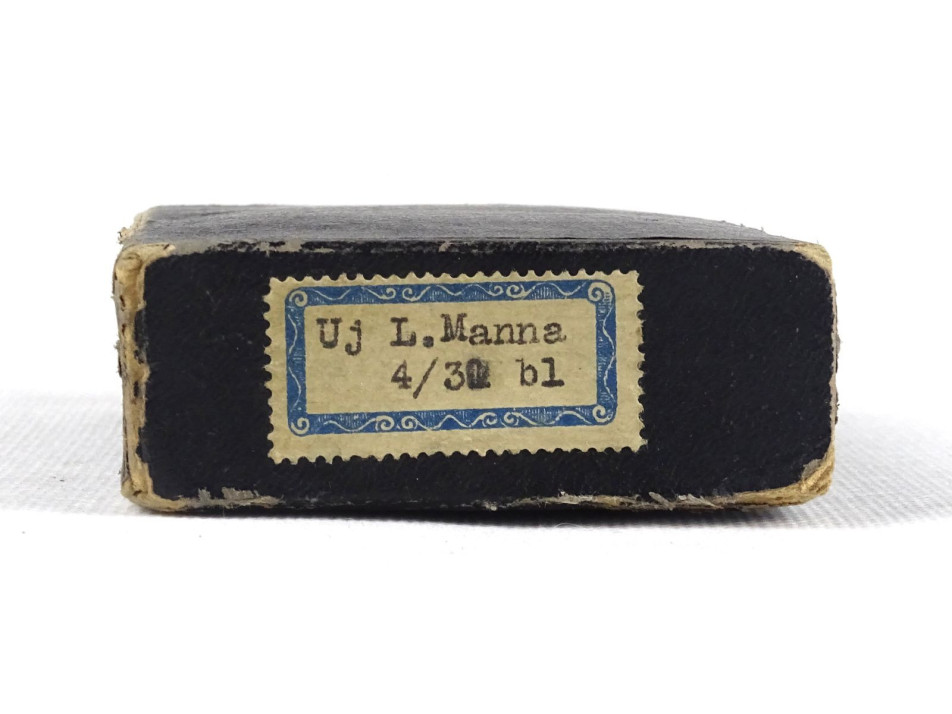 Régi, kis méretű bőrkötéses imakönyv papír tokban.