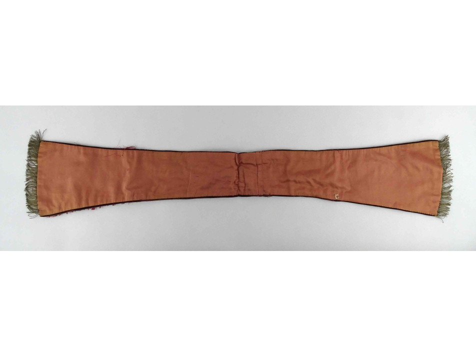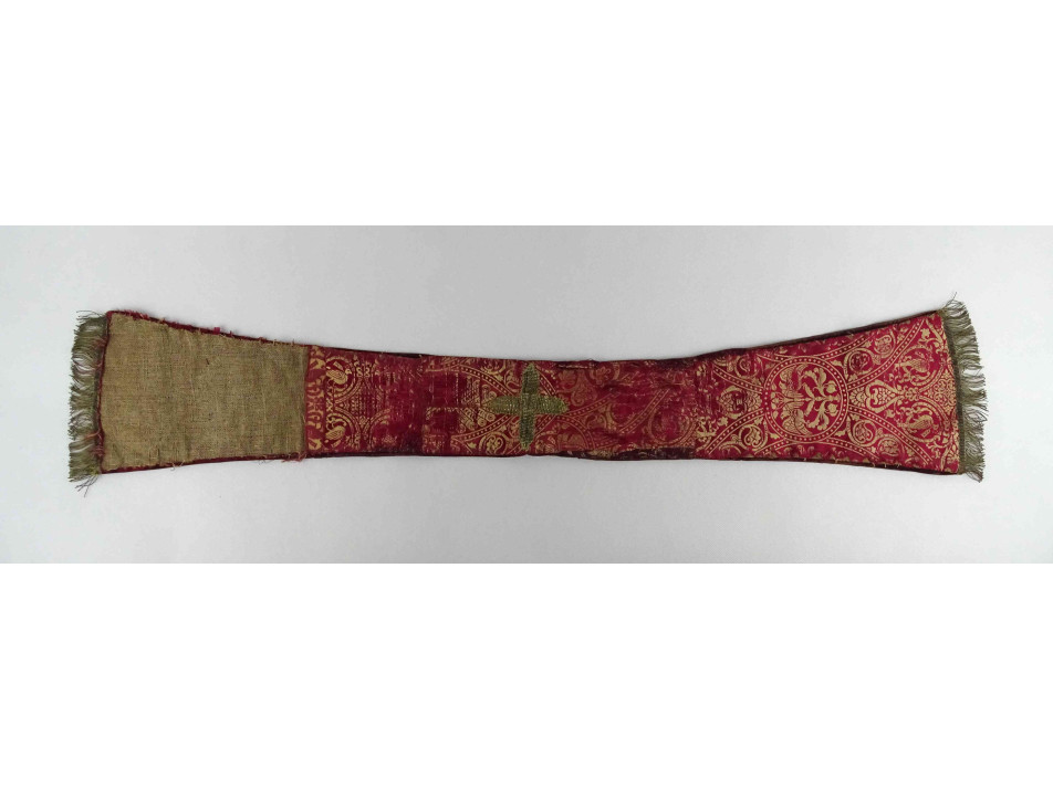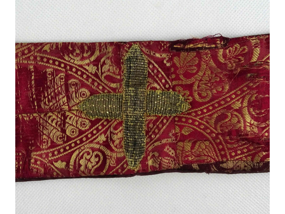 Antik, XIX. századi, szép állapotú, piros és arany színű selyem brokát, papi stóla. Anyaga erősen kopott, feslett, egy darabon hiányzik a selyem szövet. Középen hímzett arany kereszttel díszítve. Két végén arany színű szövet rojtozás található.
