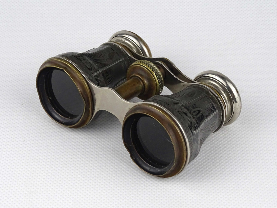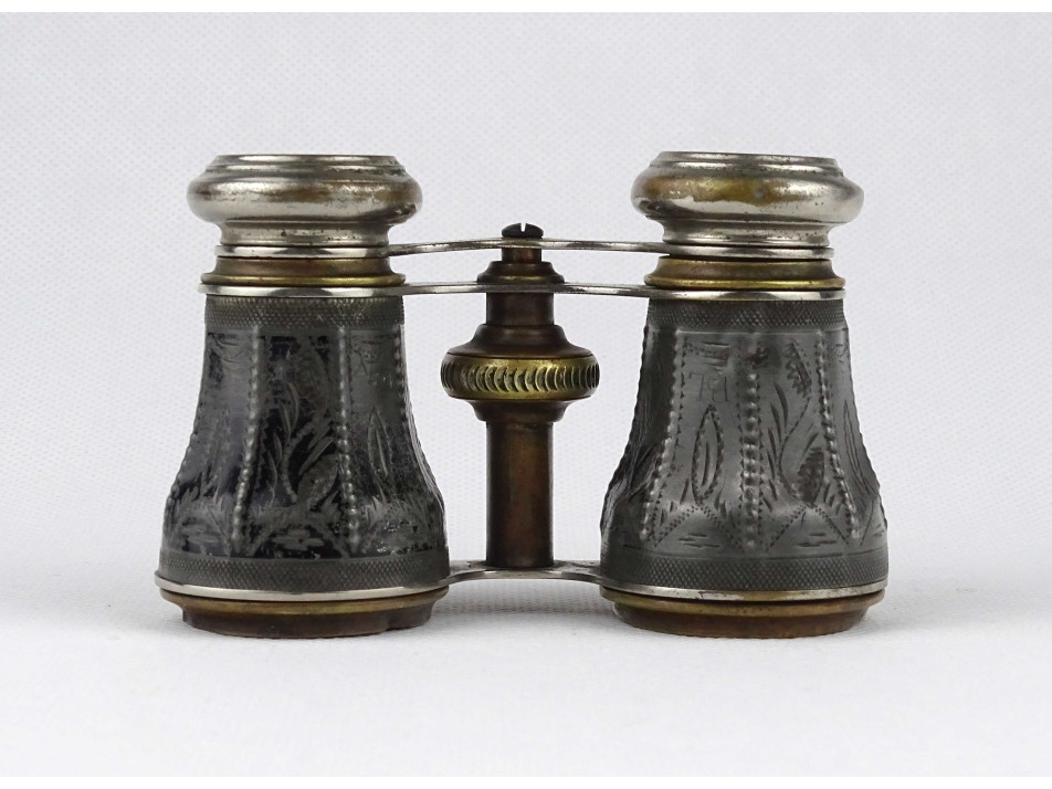 Antik, réz testű, díszes, domborított, ón lemezzel borított távcső, színházi látcső. Lencséi épek, felülete kopottas, patinás.