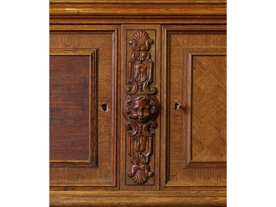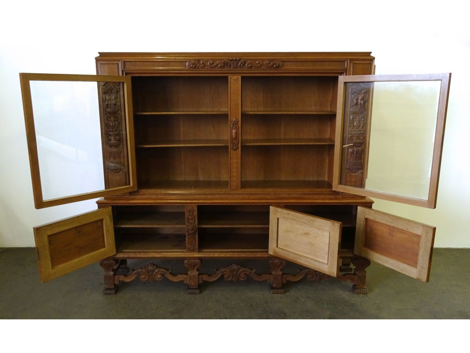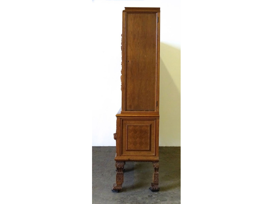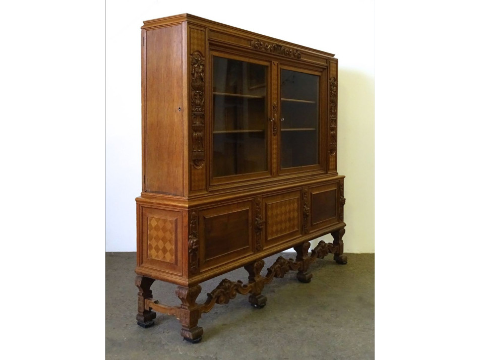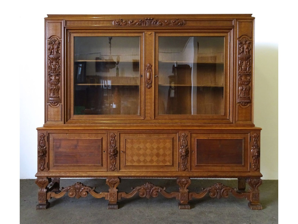 Antik, ügyvédi irodába való könyvszekrény, nagy méretű üveges, polcos dúsan faragott iratszekrény. Gazdagon faragott, pepita furnér intarziával díszített. Rajta faragott fejek és puttó díszek láthatóak.