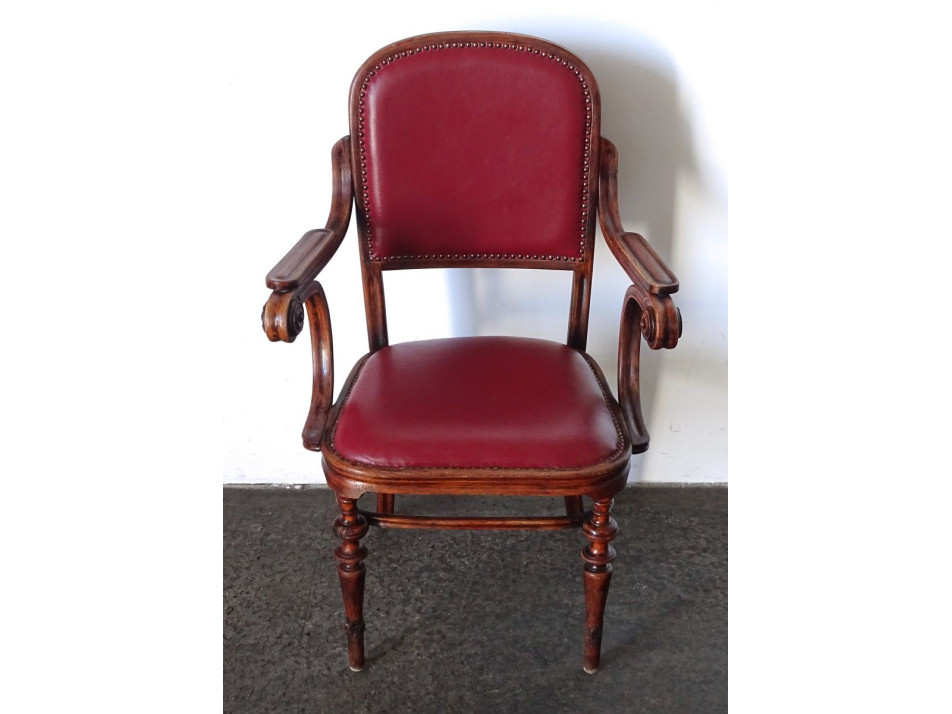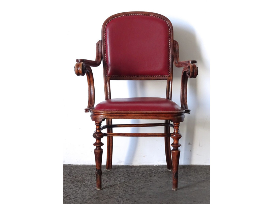 Antik szép állapotú támlás szék bőr felülettel. A kárpit körben szegecselt. Karfái csigás faragott díszítésűek.