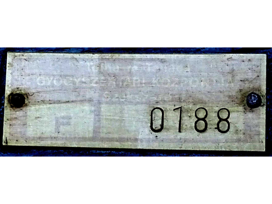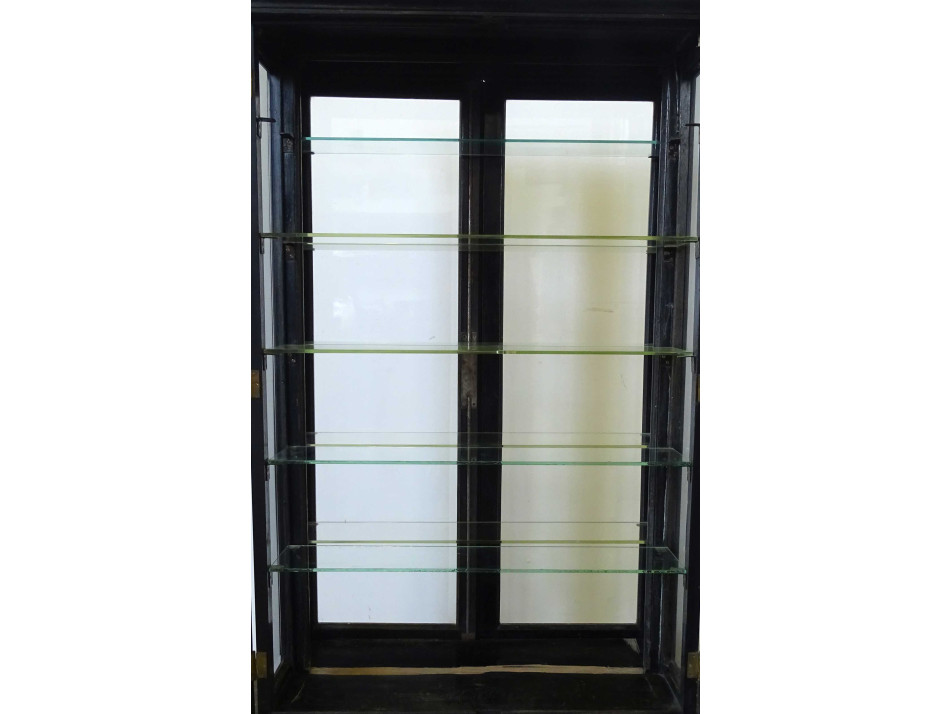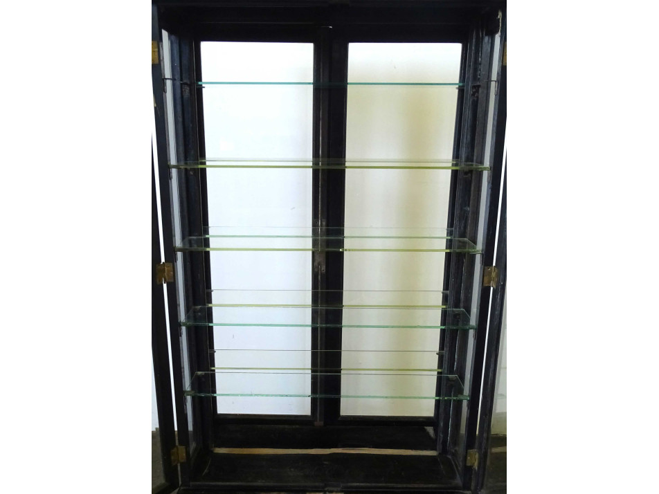 Antik, üvegajtós, üvegpolcos, mindkét oldalról nyitható, fekete színű gyógyszertári vitrin, patika bútor. Ajtajaiban és oldalsó üvegeiben metszett üvegtáblák találhatók. Az egyik üvegpolca hiányzik, de ez könnyen pótolható.