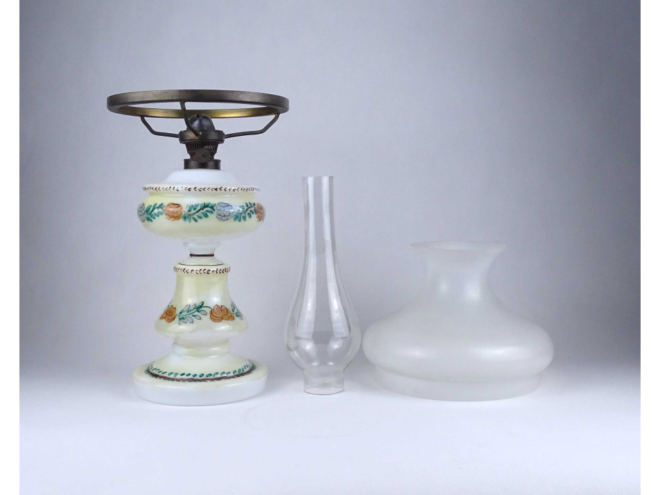 Antik, hibátlan állapotú, üveg petróleum lámpa, kézzel festett virágdíszítéssel, 20.5 cm átmérőjű tejüveg búrával, hibátlan cilinderrel.