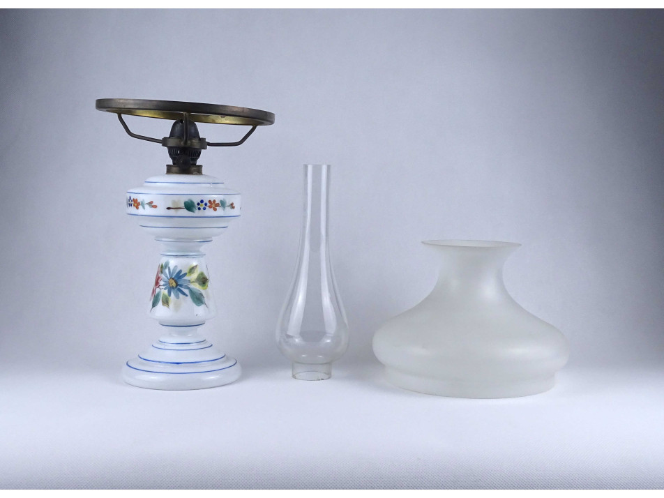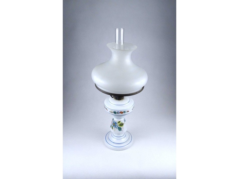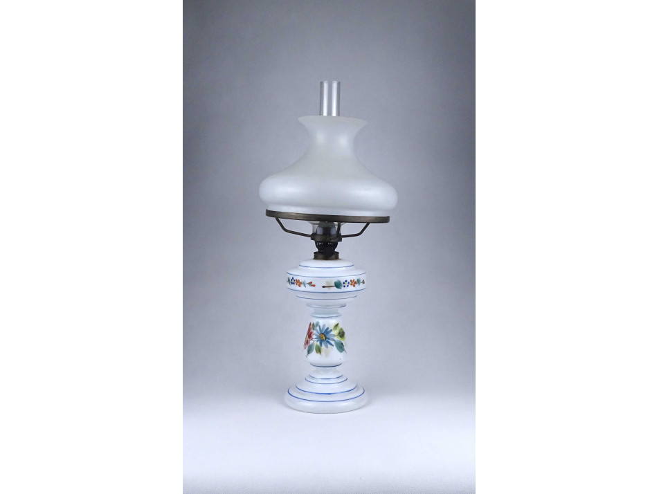 Antik, hibátlan állapotú, üveg petróleumlámpa, kézzel festett virágdíszítéssel, 20 cm átmérőjű tejüveg búrával, hibátlan cilinderrel.