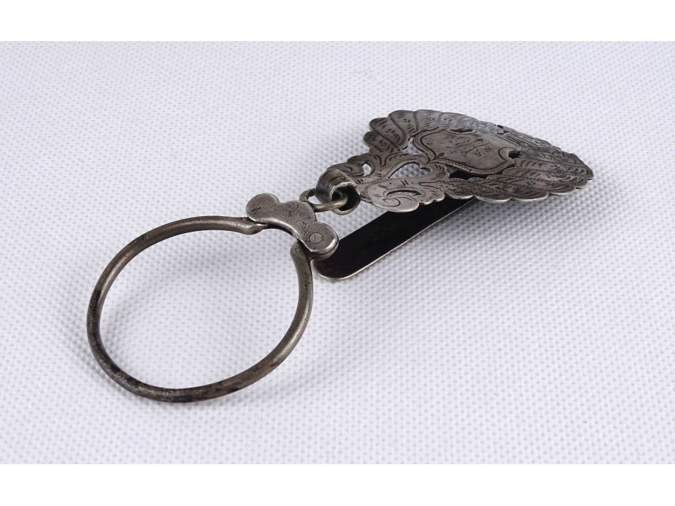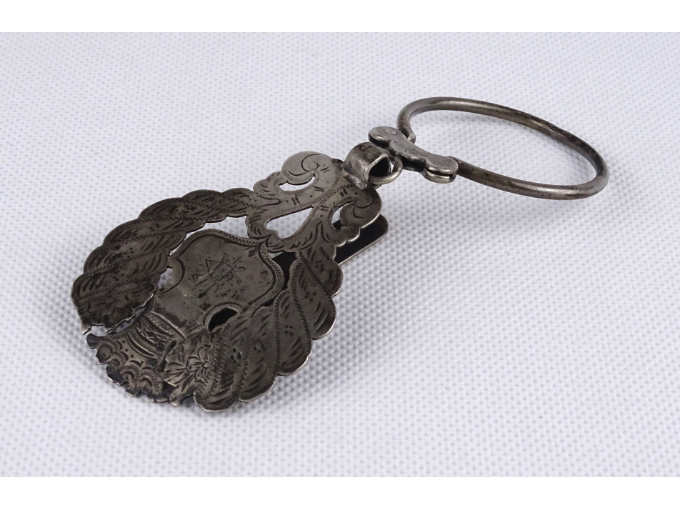 Antik díszes, vésett ezüst házmester kulcstartó 41 g