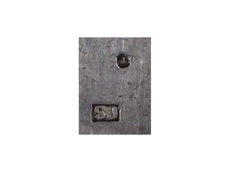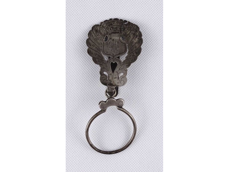 Antik, szép állapotú, vésetekkel díszített, koronás, monogramos házmaster kulcstartó. Rajta 1937-ig használt, jobbra néző 4-es Diána fejes, 750-es finomság jelzés, mellette a "P" hivataljegy és az " SJ " mesterjegy látható.