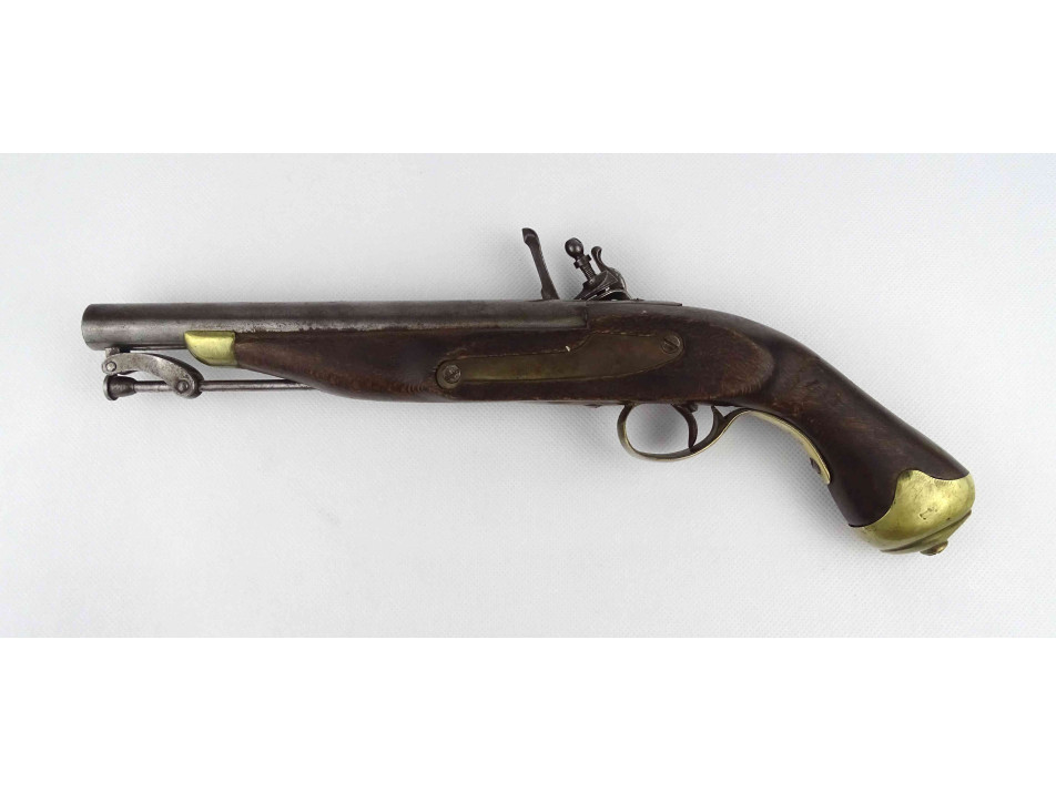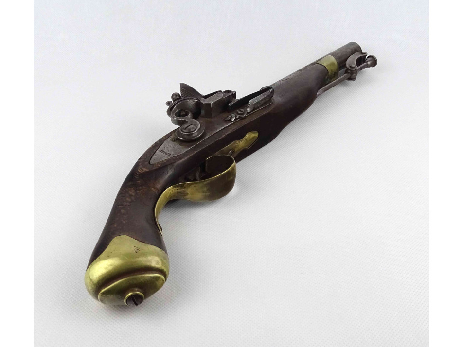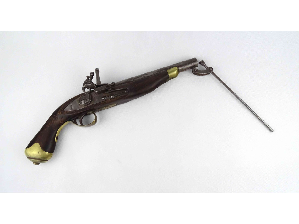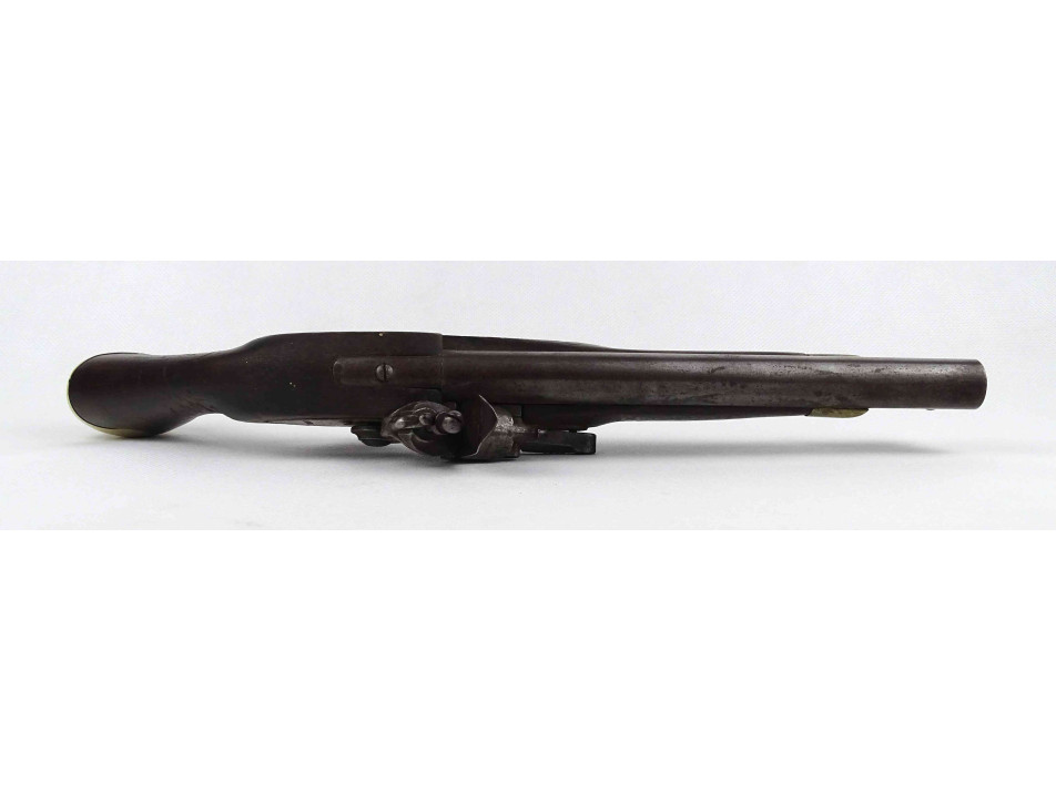 Antik jelzett angol elöltöltős feketelőporos pisztoly, szép állapotú fa ágyazattal, kovácsoltvas szerkezettel az 1800-as évekből.