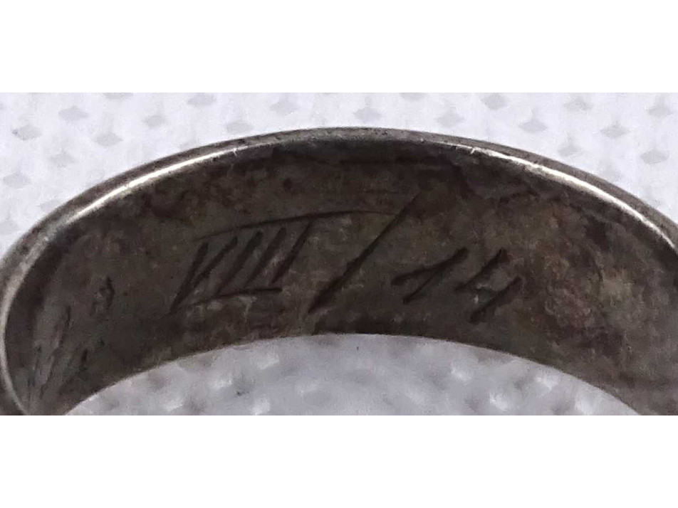 Antik, vésett feliratos acél gyűrű, világháborús emléktárgy, mely az első világháború kezdetén, 1914-ben indult "Aranyat vasért" mozgalomhoz kapcsolódik.