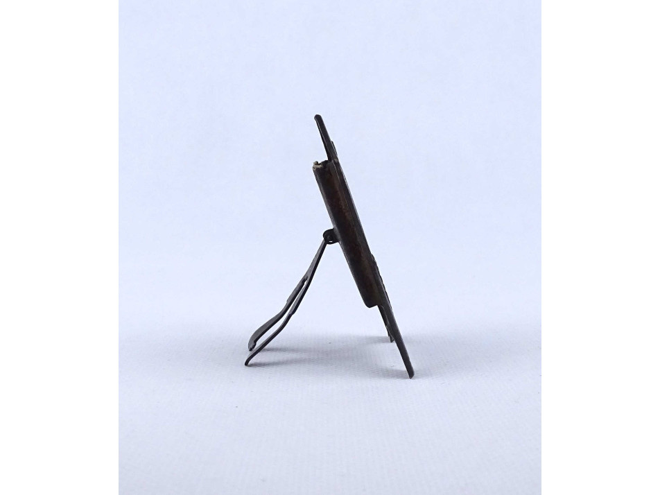 Antik, kisméretű, díszes különleges szecessziós, virágdíszes, acélból készült talpas fénykép keret, fotókeret, keret üveglappal, szép állapotban. Benne egy kisméretű babafotó.