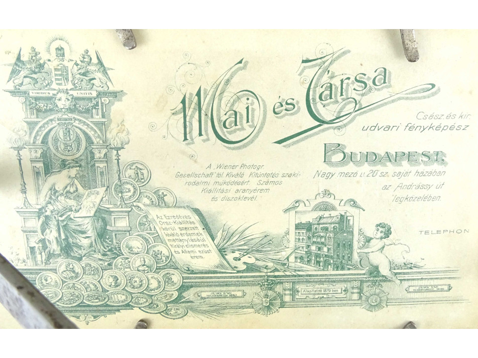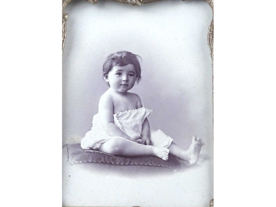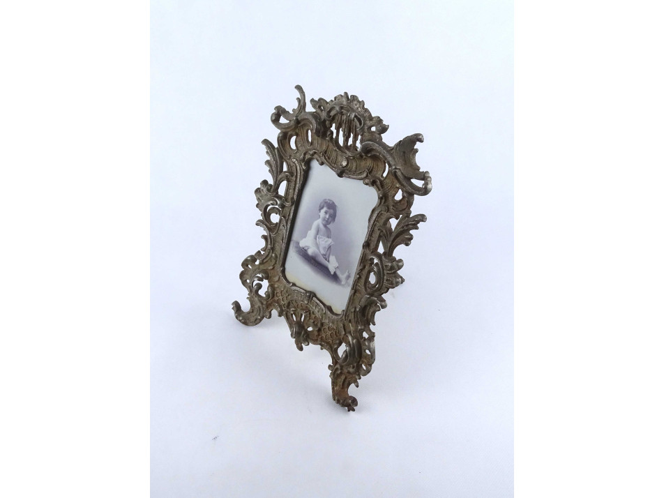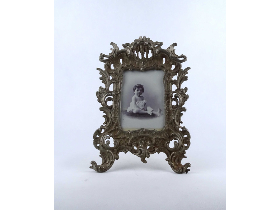 Antik nagyméretű barokk díszítéses állványos öntöttvas fényképkeret, fotókeret behajtható hátsó támasztóval. Benne kisgyermeket ábrázoló antik fotográfia.