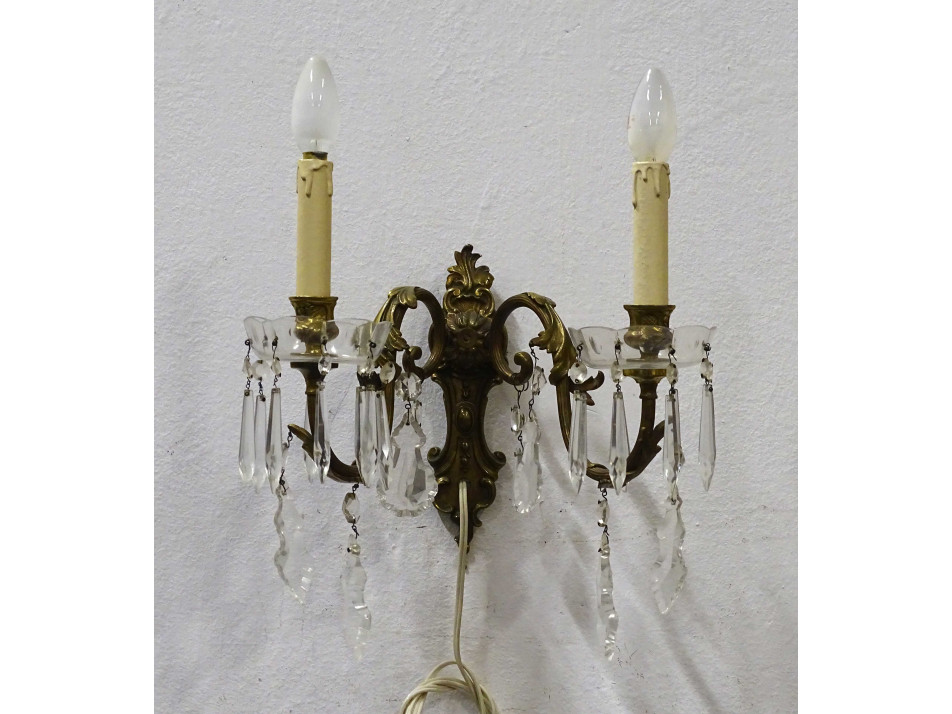 Antik, kétágú falikar kristály függőkkel díszítve. A karok papírmasé gyertyákban végződnek. Kisméretű (E14) izzó való bele. Hiánytalan állapotú, minden függője megvan. A vezetéke mindenképp cserére szorul, jelen állapotában nem lehet a hálózatba dugni, így kipróbálva sem lett.