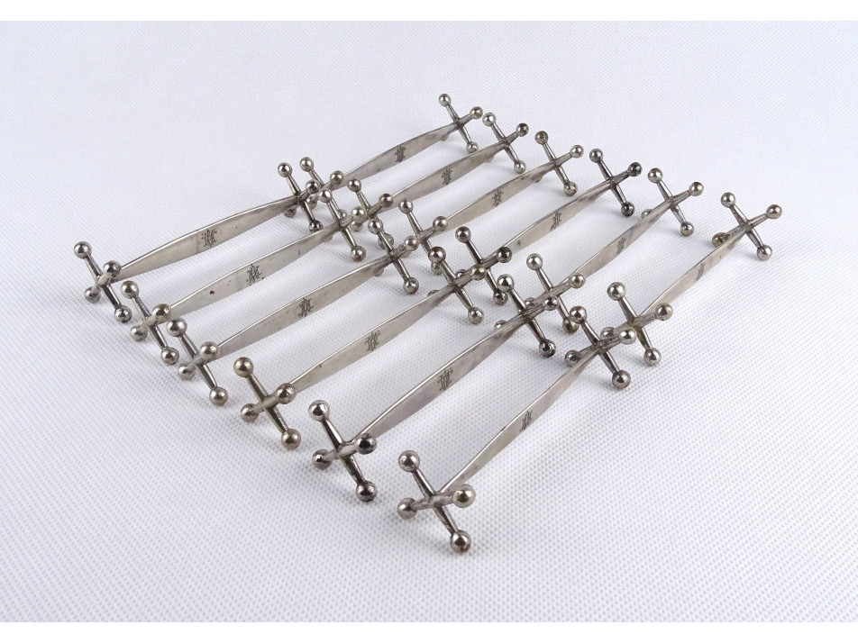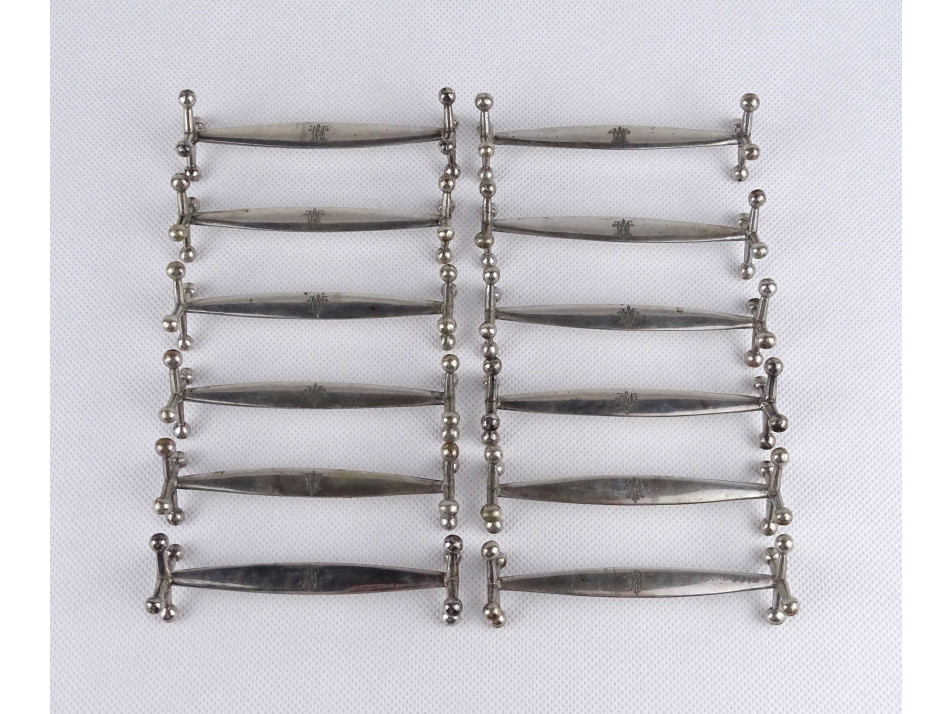 Antik 800-as finomságú, 12 darabos, monogramos ezüst késbak, evőeszköztartó készlet. Rajta 1937-ig használt, jobbra néző 3-as Diána fejes, 800-as finomság jelzés, mellette " BB " mesterjegy látható.