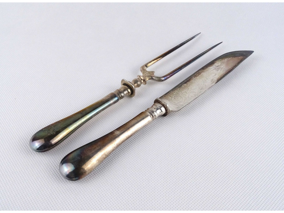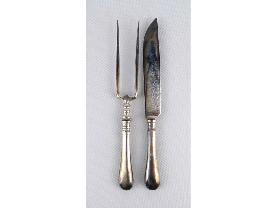 Antik ezüst nyelű hússzedő villa, húsvilla és nagykés