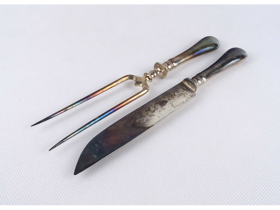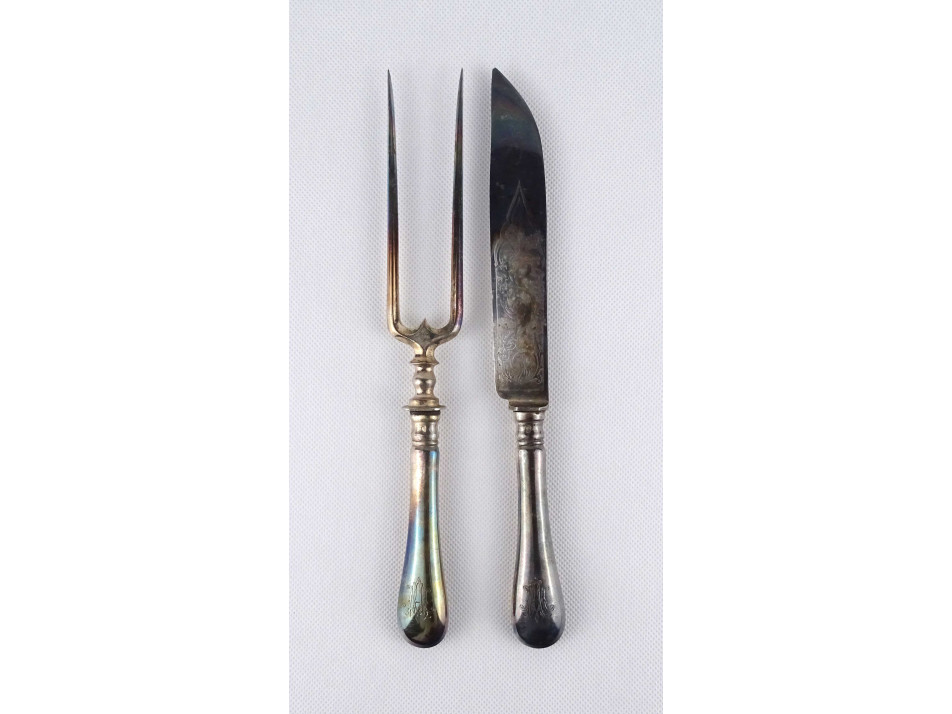 Antik, nagyméretű, monogramos húsos villa, hússzedő villa és hozzá tartozó nagykés. Az acél villa és késpenge gazdagon díszített, vastagon ezüstözött. A nyelük jelzett, 800-as finomságú ezüstből készült. Rajta az 1937-ig használt jobbra néző 3-as Diána fejes, 800 -as finomság jelzés, melette "BB" mesterjel.