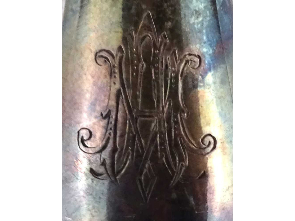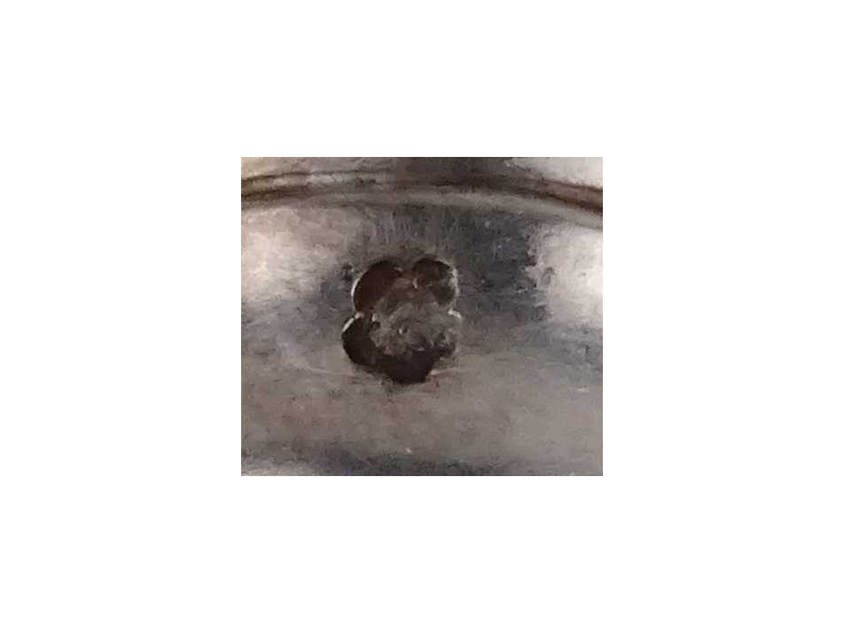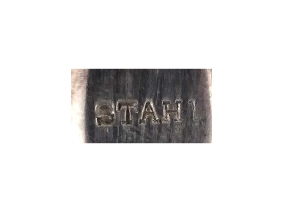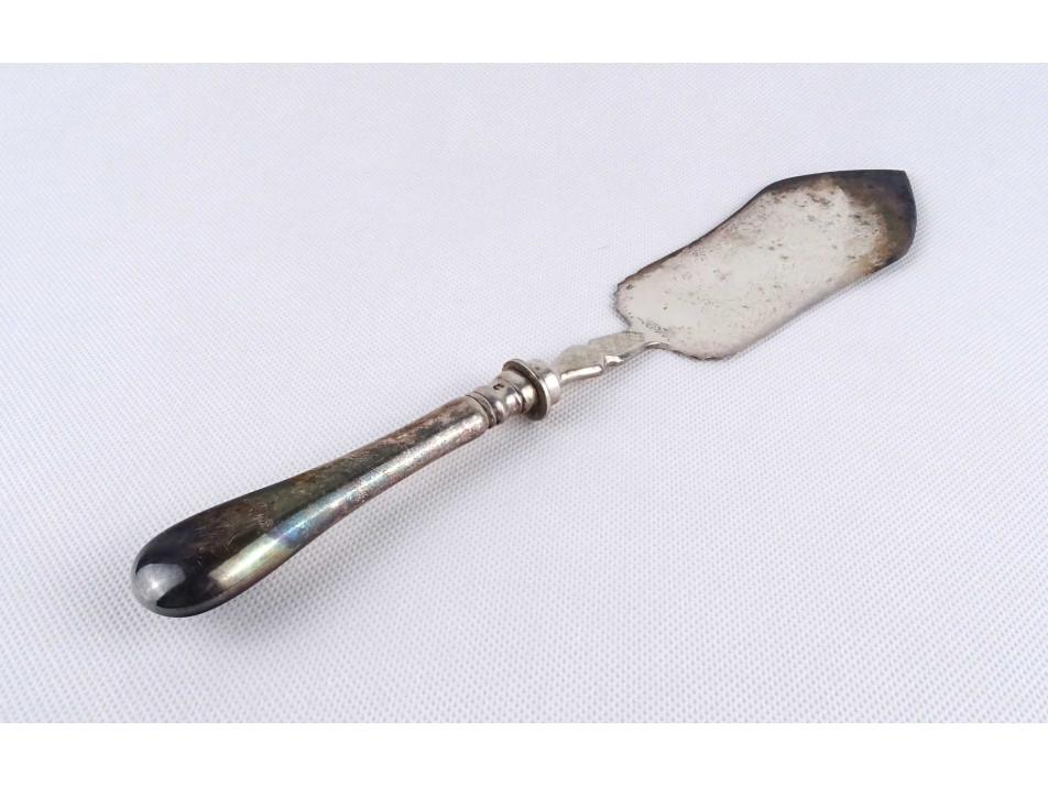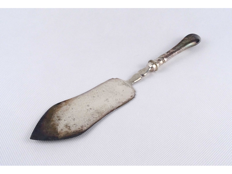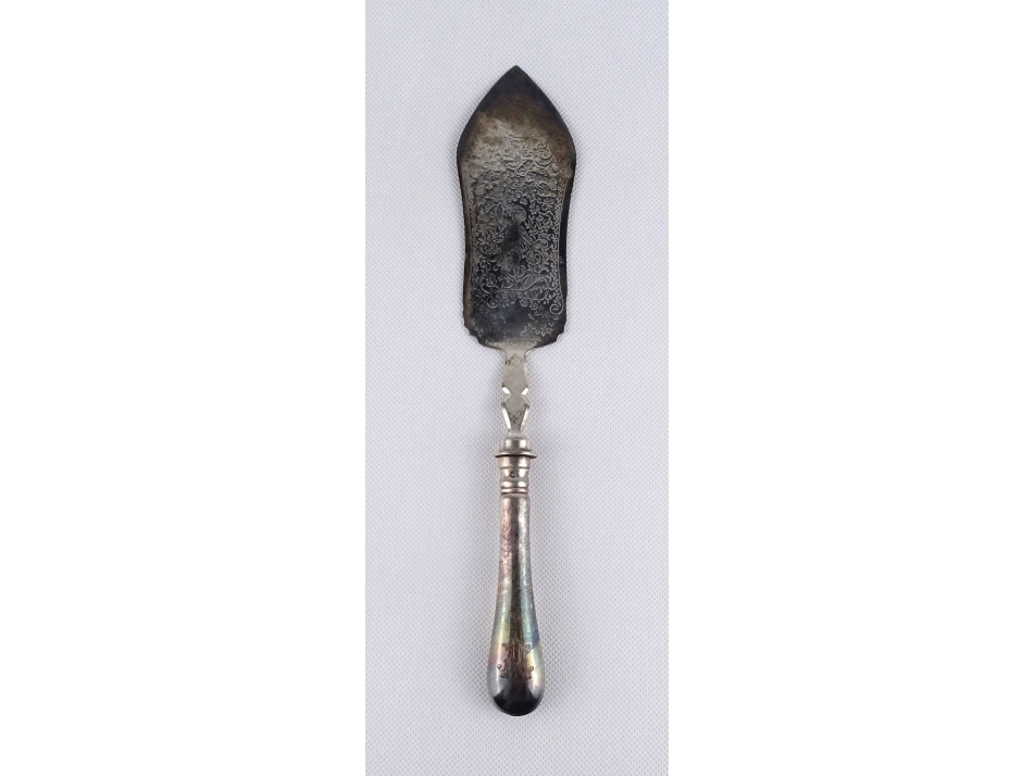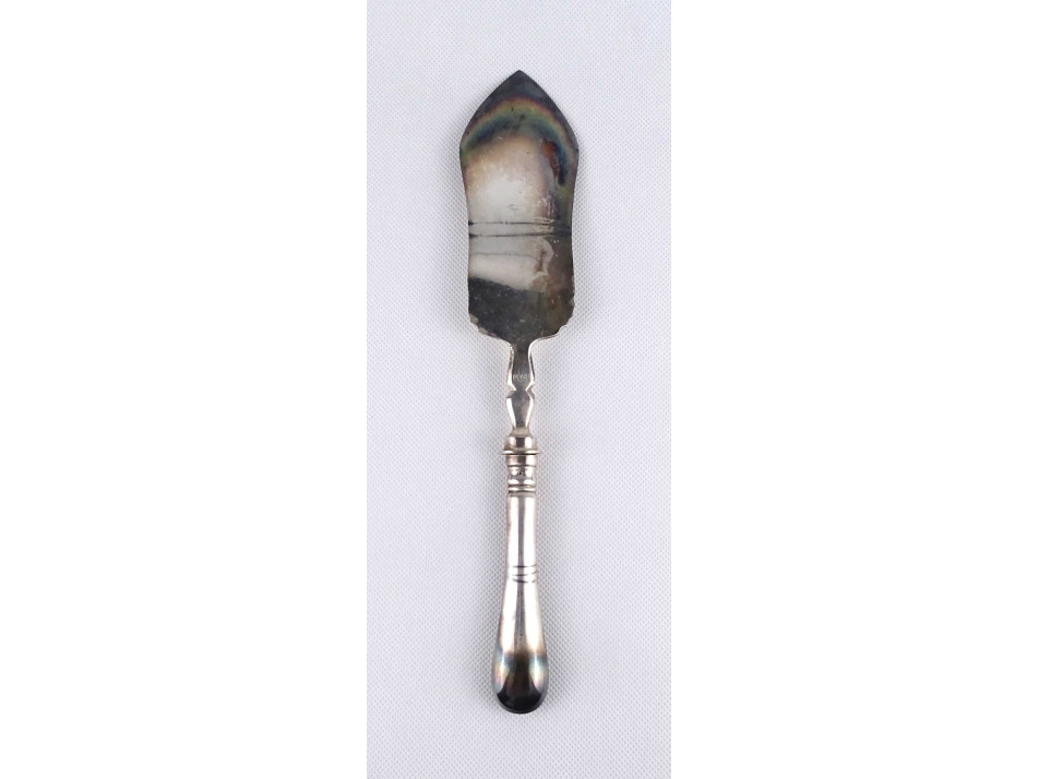 Antik, nagyméretű, monogramos tortalapát. Az acél penge gazdagon díszített és vastagon ezüstözött. A nyél jelzett, 800-as finomságú ezüstből készült. Rajta az 1937-ig használt jobbra néző 3-as Diána fejes, 800 -as finomság jelzés, melette "BB" mesterjel.