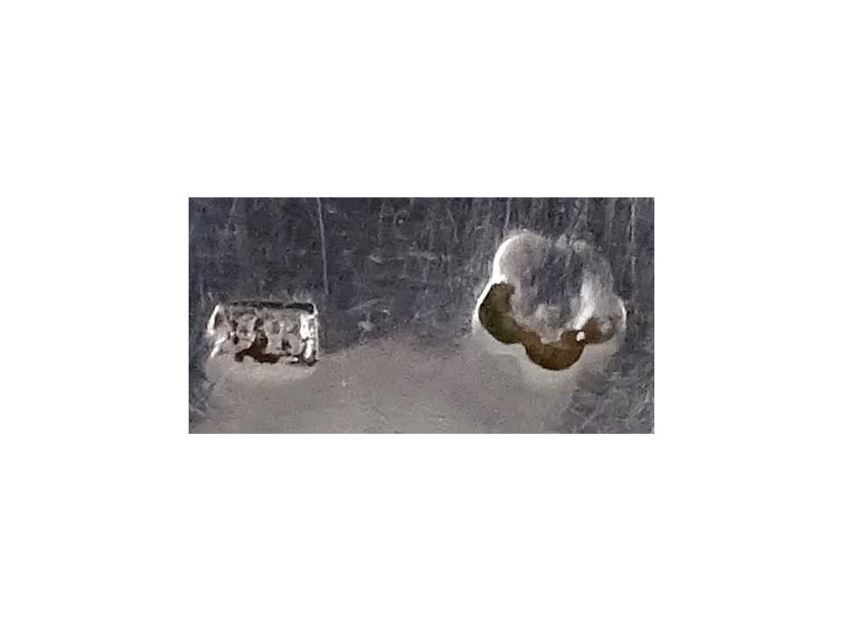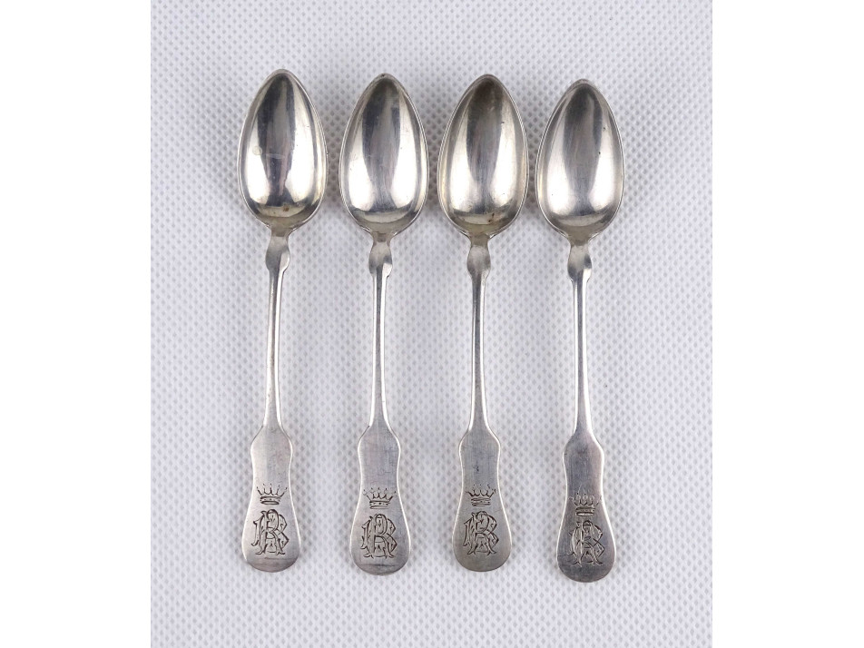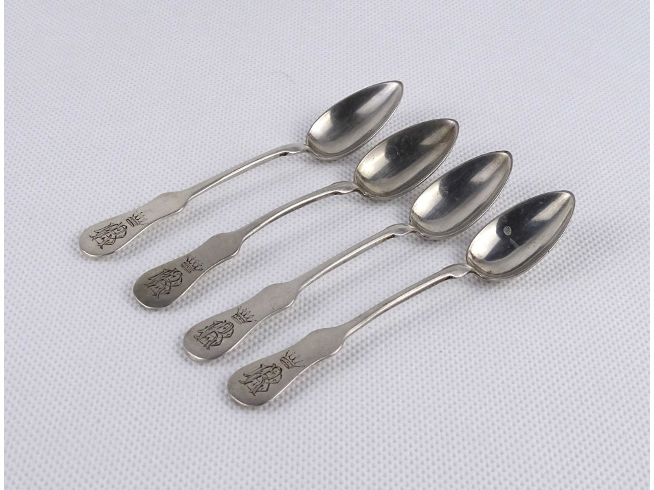 Antik 800-as finomságú, 4 darabos, monogramos ezüst kis kanál, mokkáskanál készlet. Rajta 1937-ig használt, jobbra néző 3-as Diána fejes, 800-as finomság jelzés, mellette " JB " mesterjegy látható.