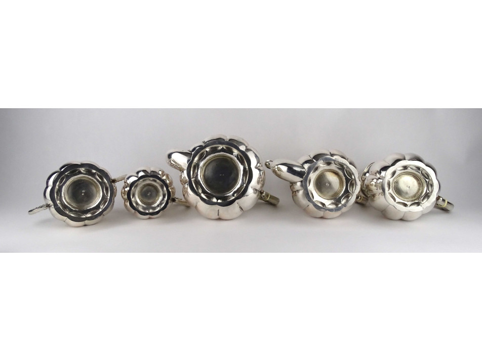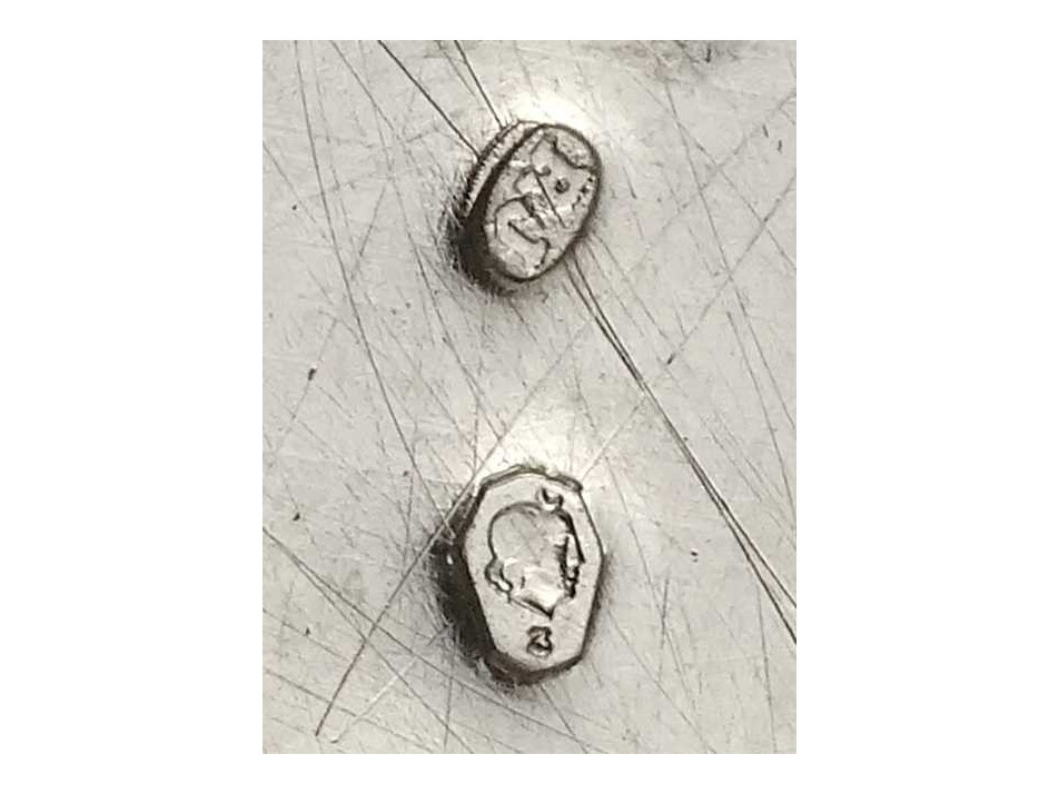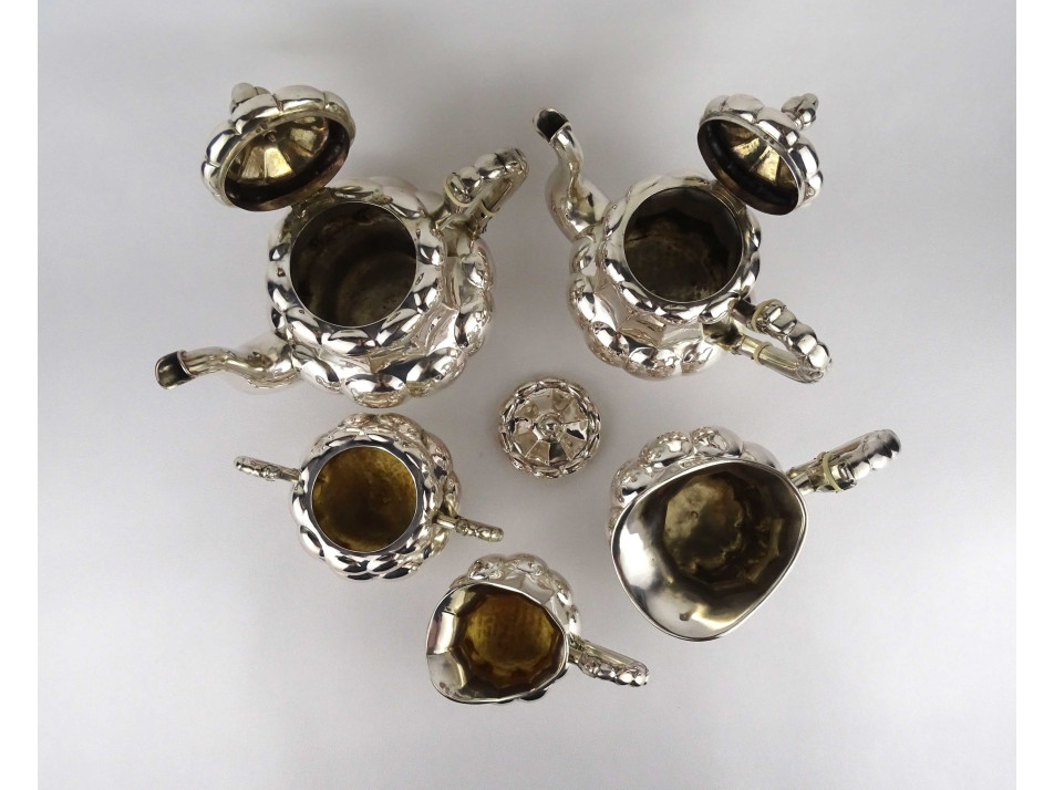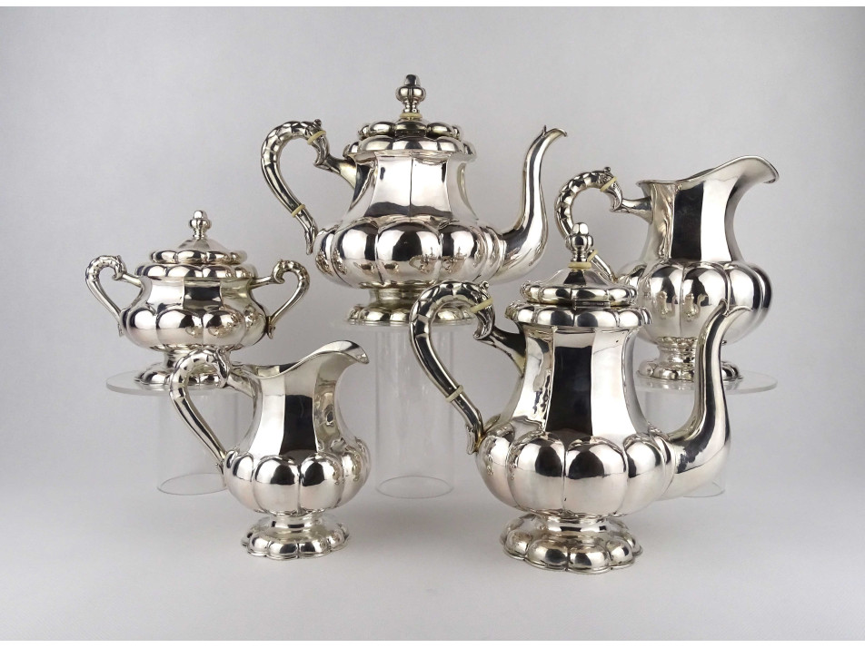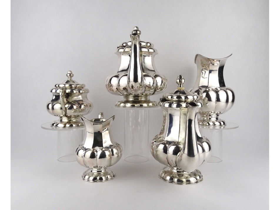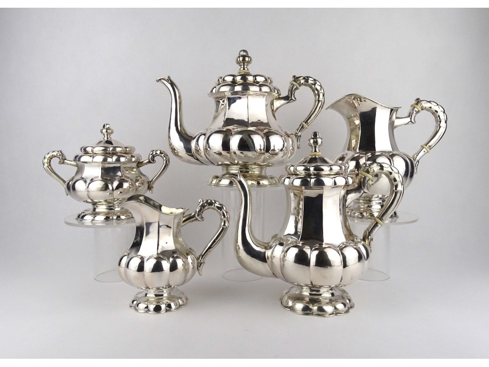Régi, 800-as finomságú, nagyméretű, domború bordázott mintájú, egységes stílusú ezüst kávés és teás kanna, a hozzájuk tartozó kiöntőkkel és egy fedeles bonbonierrel, gyönyörű, felpolírozott állapotban. Rajtuk 1937-től használt, jobbra néző 3-as Diána fejes, 800-as finomság jelzés, mellette "RJ" mesterjegy látható.