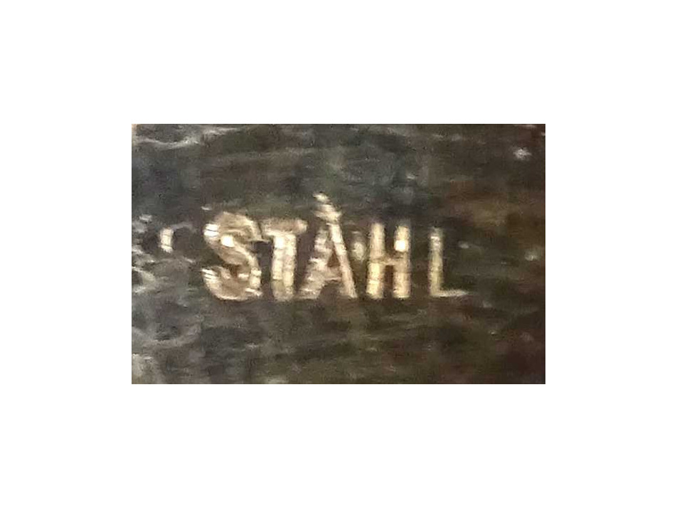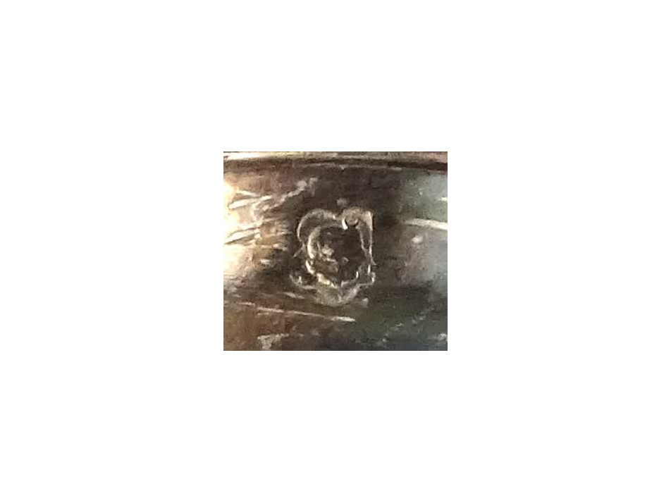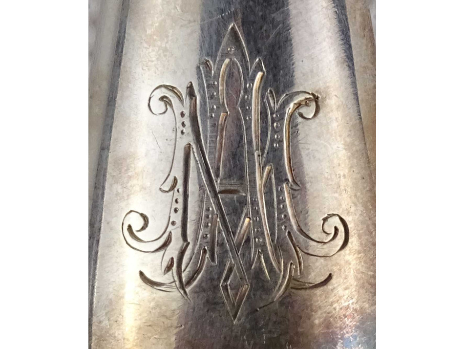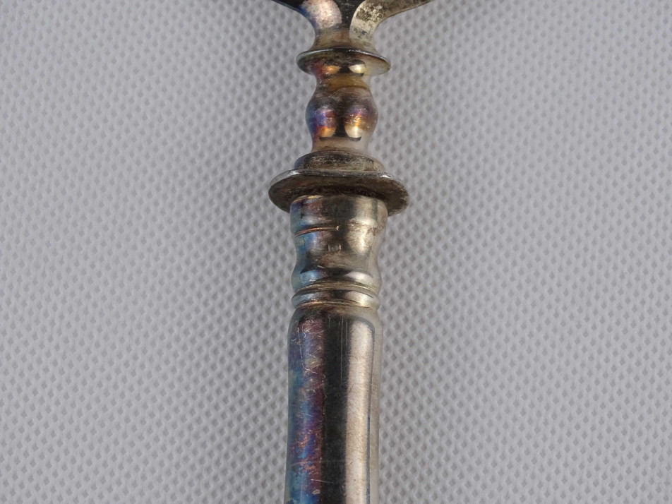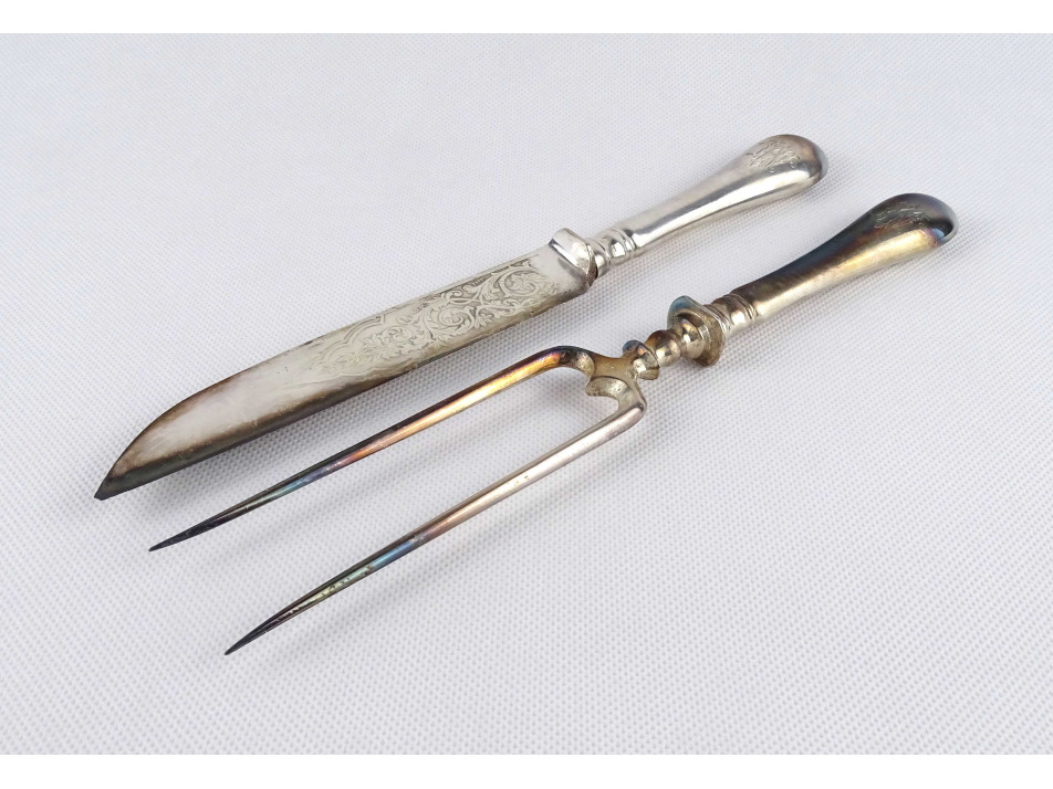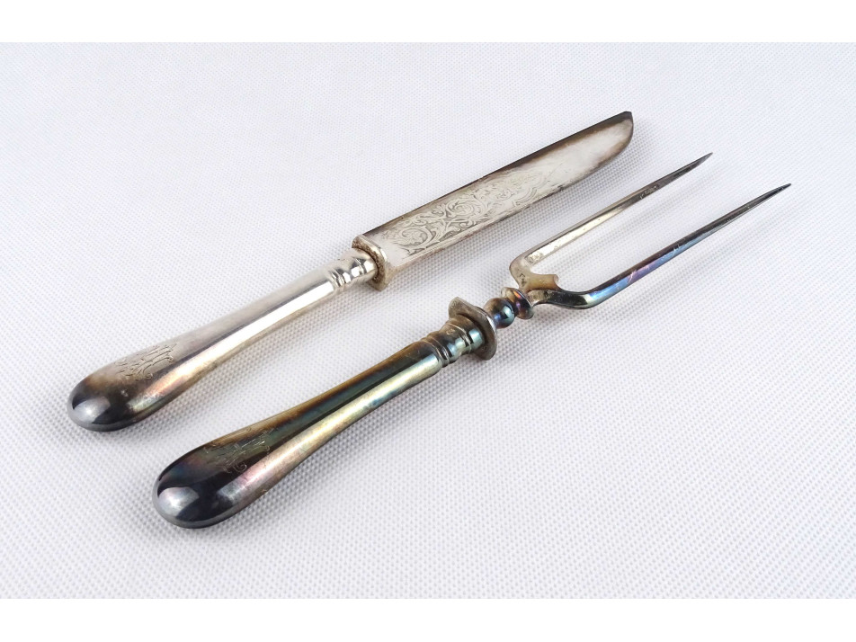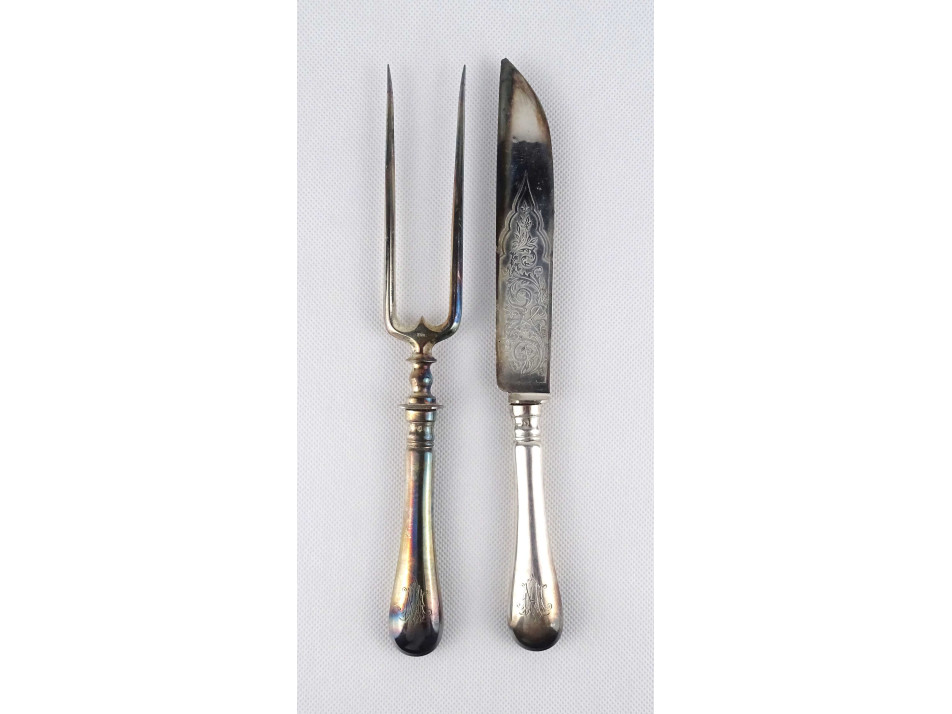 Antik, nagyméretű, monogramos húsos villa, hússzedő villa és hozzá tartozó nagykés. Az acél villa és késpenge gazdagon díszített, vastagon ezüstözött. A nyelük jelzett, 800-as finomságú ezüstből készült. Rajta az 1937-ig használt jobbra néző 3-as Diána fejes, 800-as finomság jelzés, melette "BB" mesterjel.