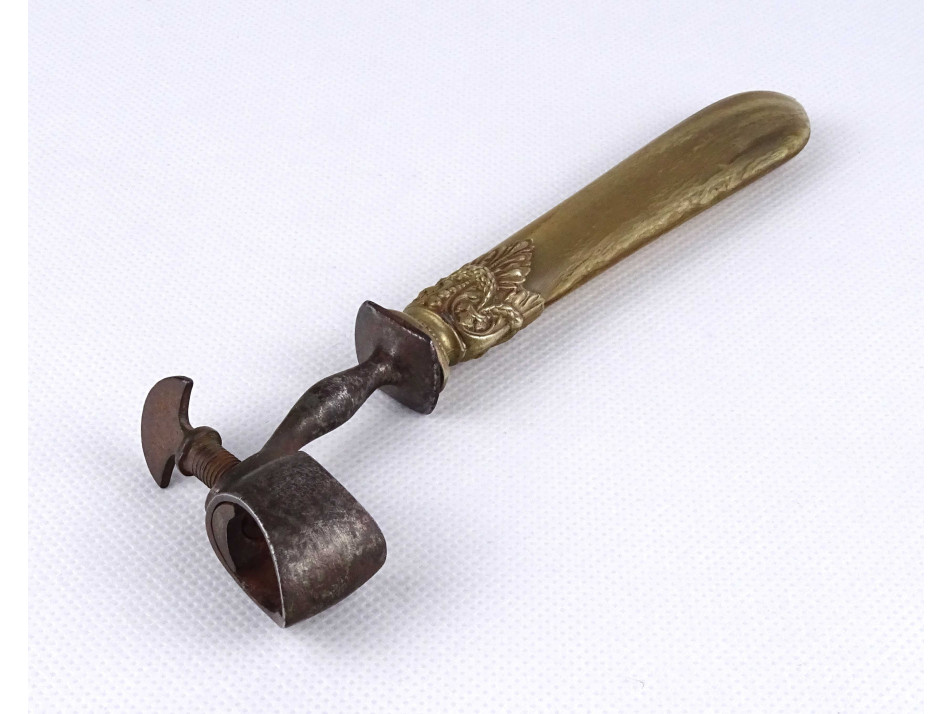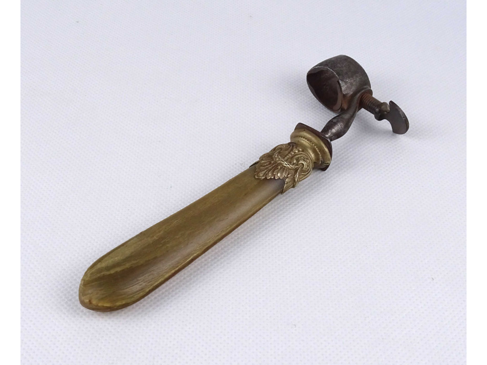 Antik, szaru markolatú, acél fejű menetes szerkezetű töltény peremező.