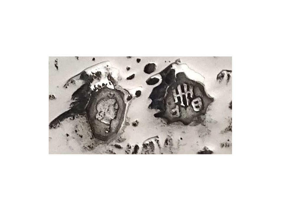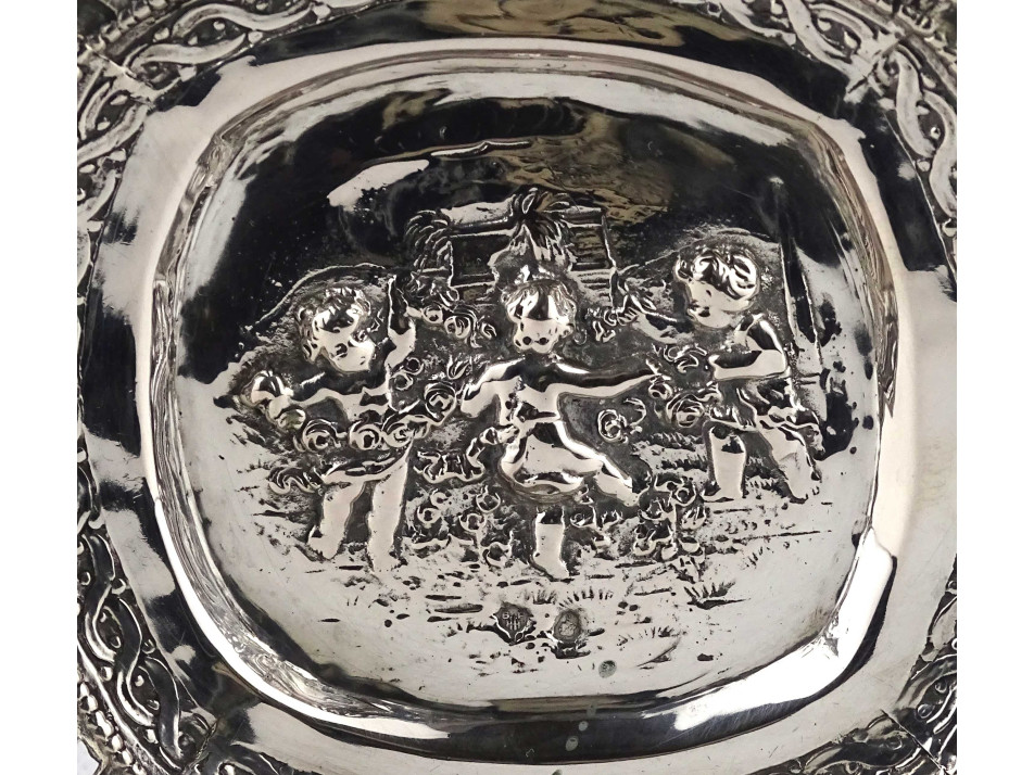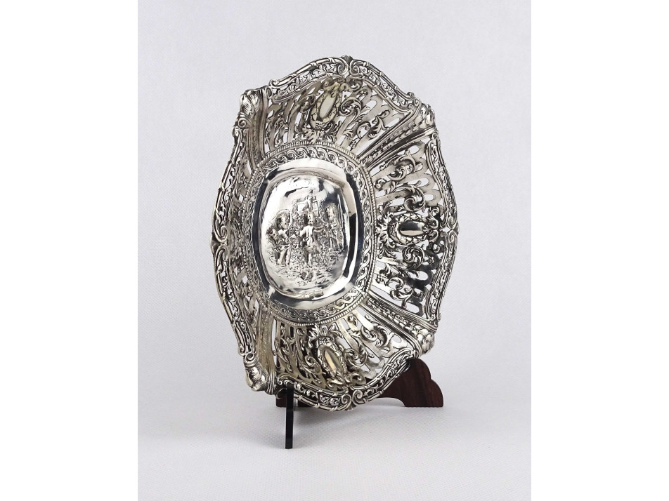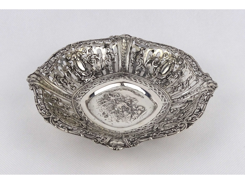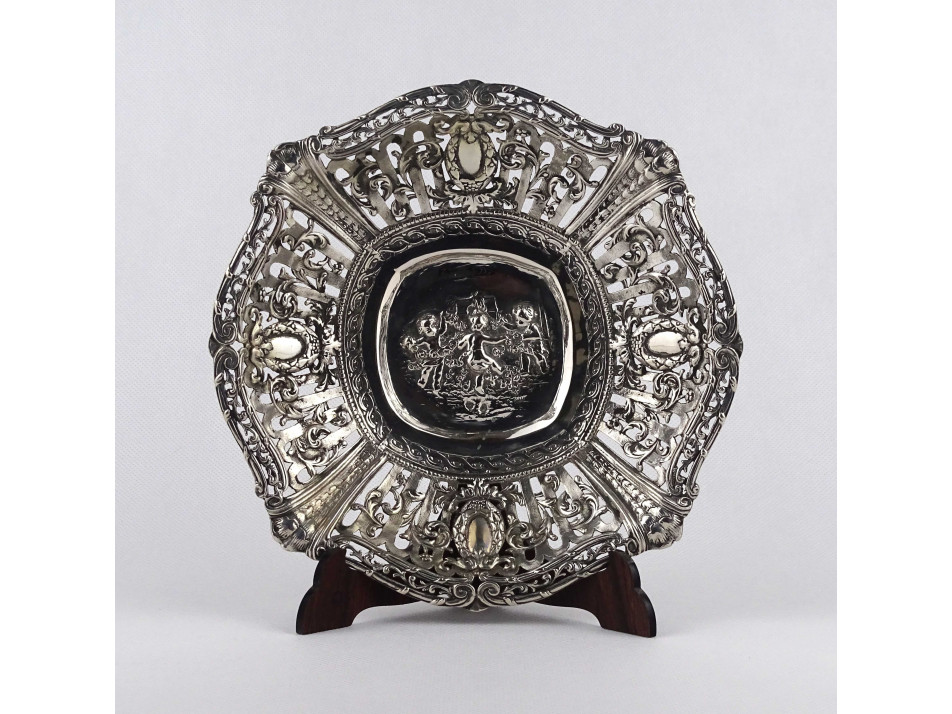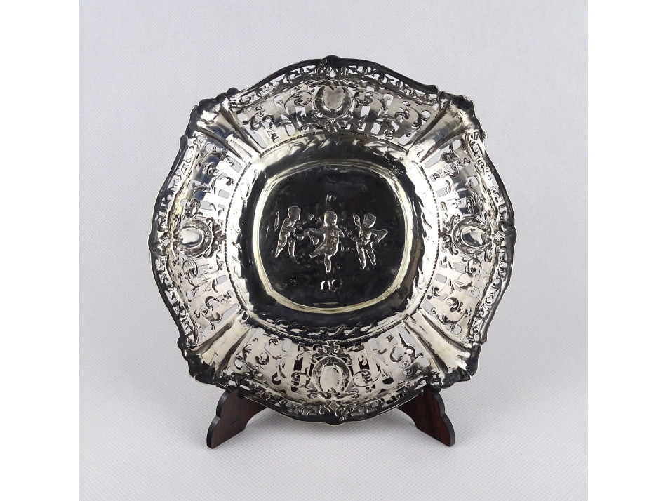 Régi, 800-as finomságú, áttört falú, domborított, angyalkás mintával díszített ezüst kosárka, kínáló kosár, gyönyörű, felpolírozott állapotban. Rajta 1937-től használt, jobbra néző 3-as Diána fejes, 800-as finomság jelzés, mellette " BP HH " mesterjegy látható.