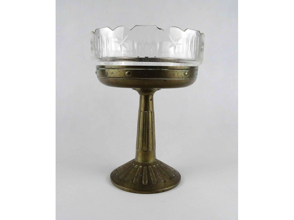 Antik, jelzetlen, sárgarézből készült, egy oszlopon álló talpas kínáló tál, asztalközép, csiszolt üvegbetéttel. A réz felületek patinásak, az üvegtál peremén egy lepattanás látható.