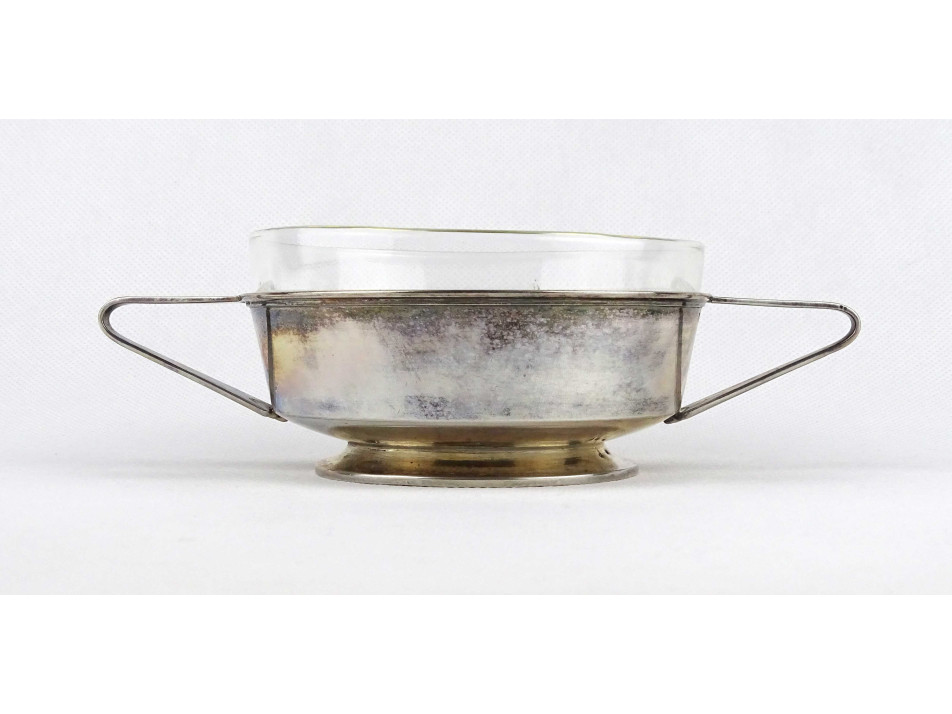 Antik monogramos üvegbetétes ezüst kínáló kosár kistál 164 g