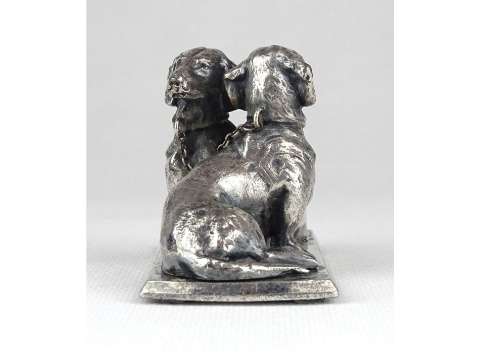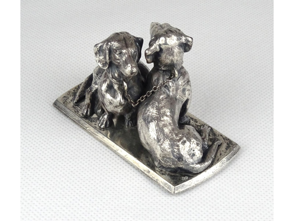 Régi, kis méretű, hibátlan állapotú ezüst talapzaton ülő ezüst tacskó pár egymásnak háttal. Szépen megmunkált ötvösmunka. Nyakörvük lánccal összekötve.