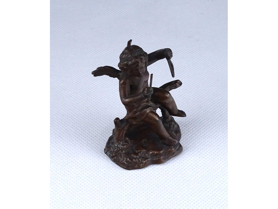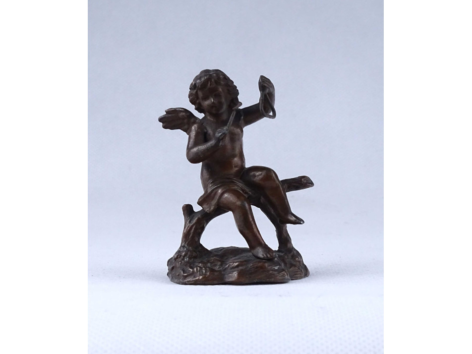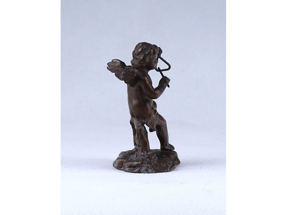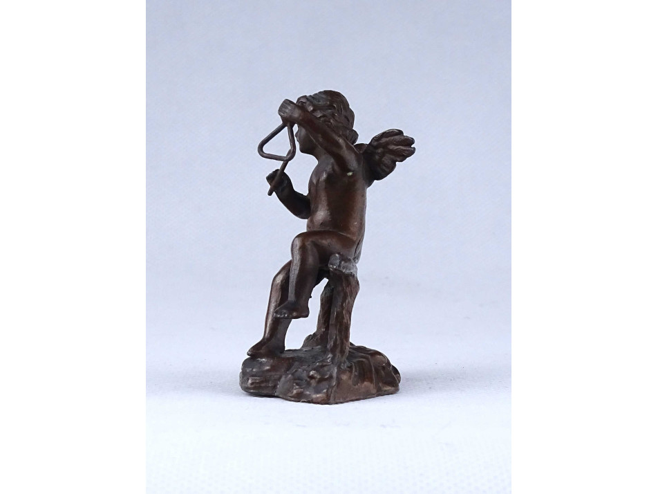 Antik, kisméretű, bronz színűre festett ón szobor, puttó, angyal kezében hangszer, triangulum. A talapzat hátulján, sérülés, repedés látható