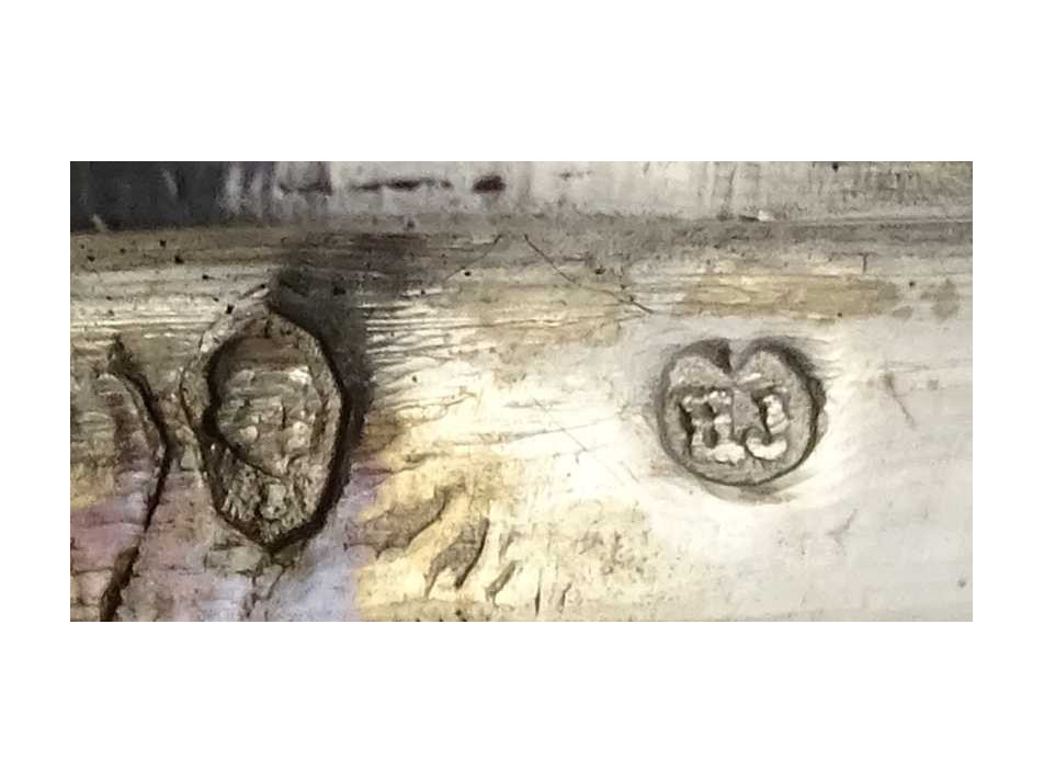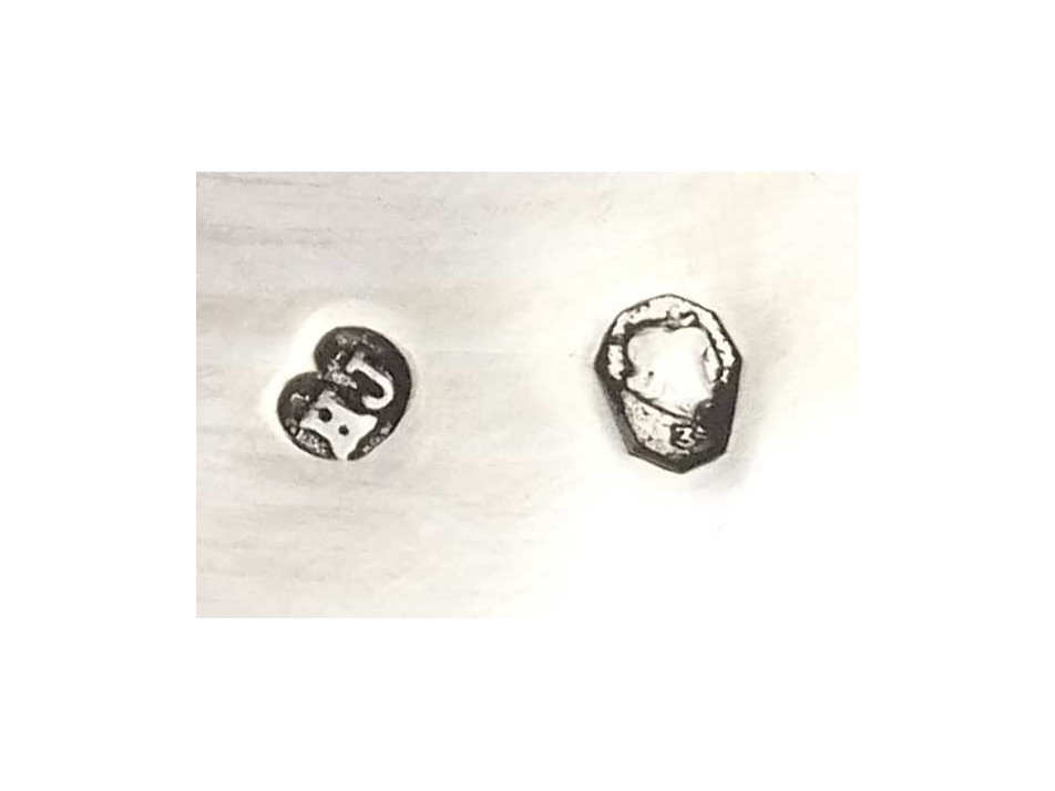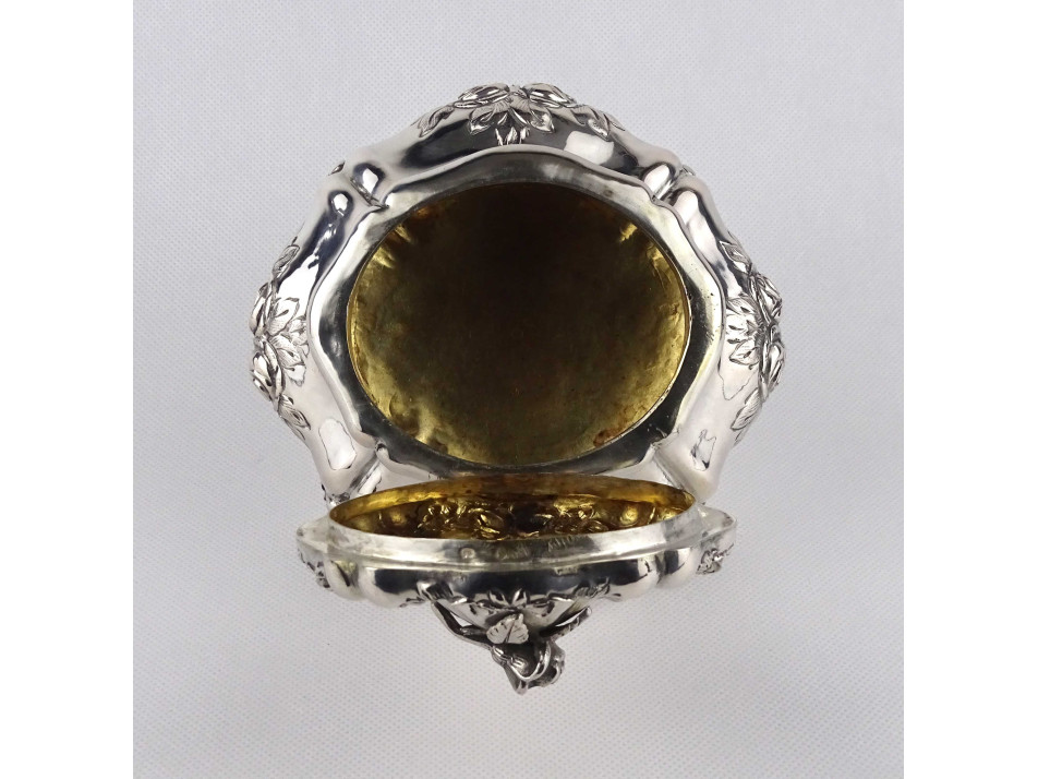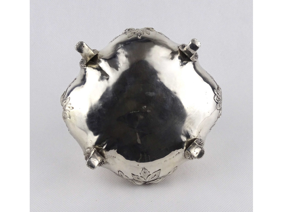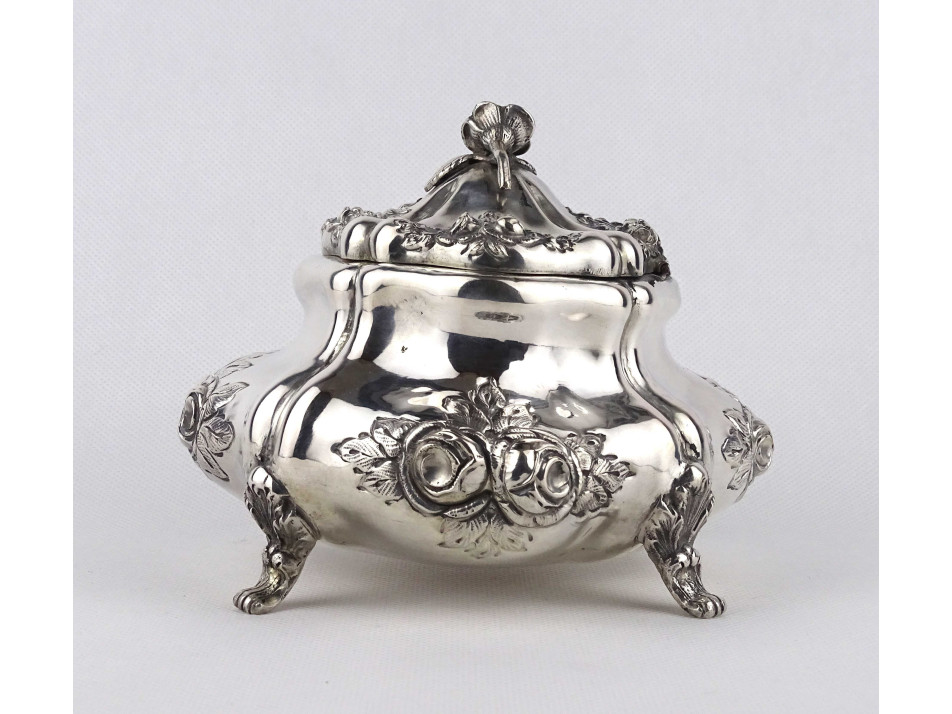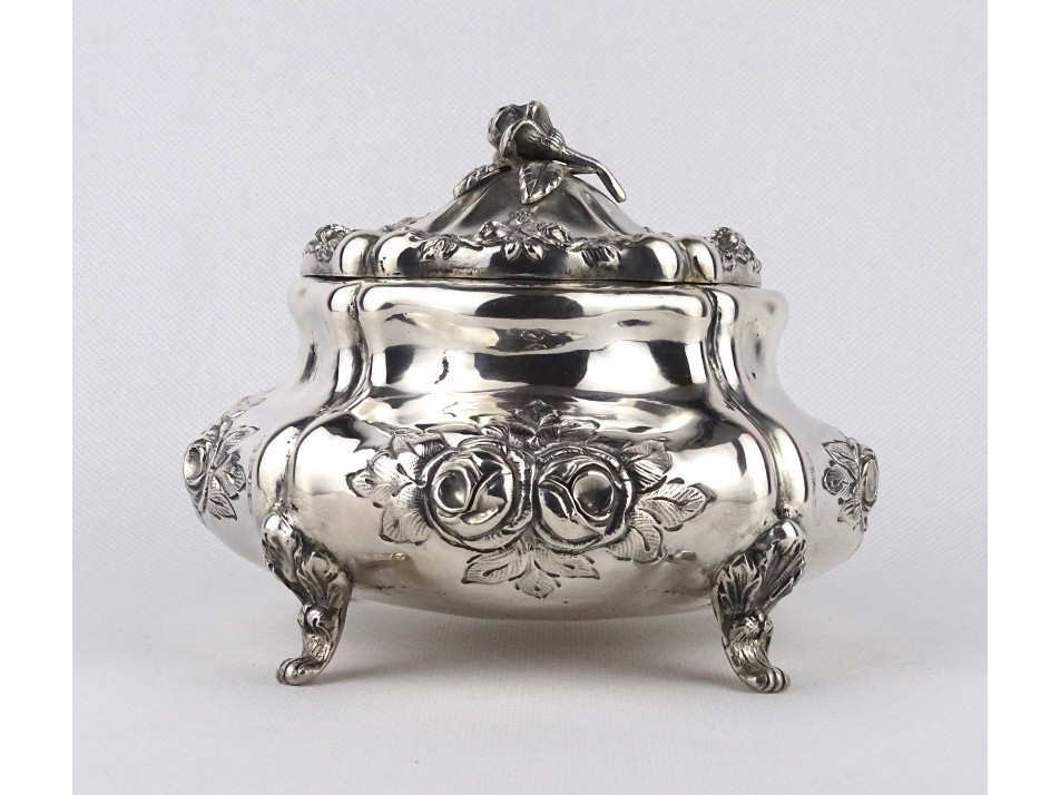 Régi, 800-as finomságú, nagyméretű, négy lábon álló, bordázott mintájú, domborított rózsákkal díszített, rózsafogantyús ezüst cukordoboz, fedeles bonbonier, gyönyörű, felpolírozott állapotban. Rajta 1937-től használt, jobbra néző 3-as Diána fejes, 800-as finomság jelzés, mellette " HJ " mesterjegy látható.