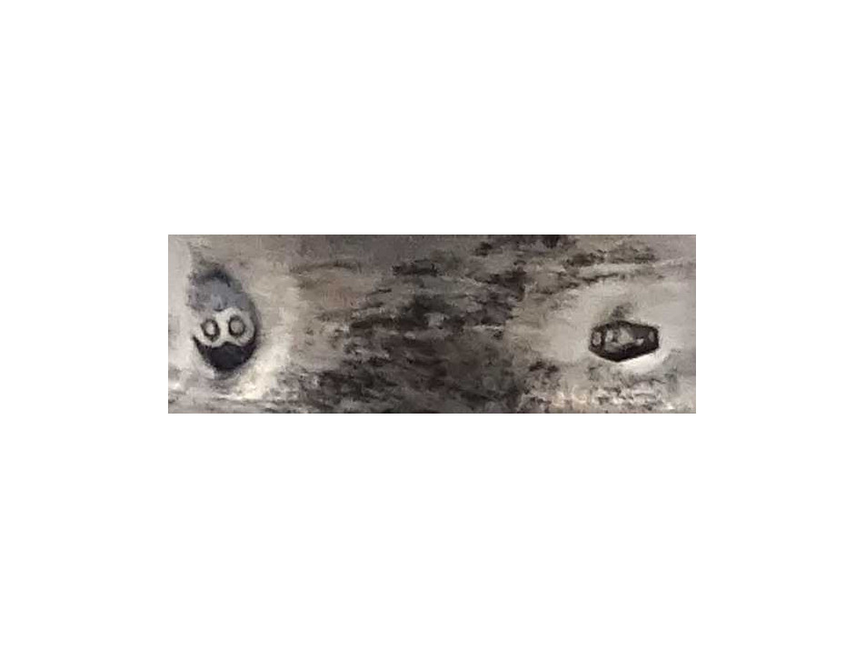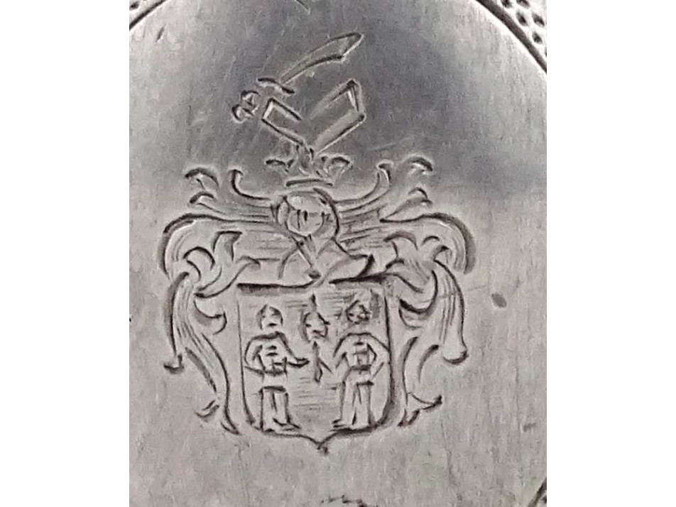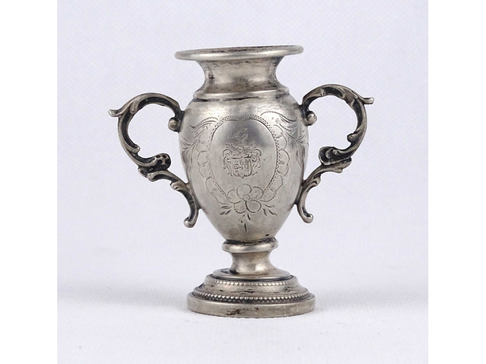 Antik, szép állapotú, kis méretű, jelzett, 800 - as finomságú ezüst váza, díszváza. Rajta vésett díszítések, köztük egy nemesi címer látható. A tárgy talpán és felső peremén az 1937-ig használt jobbra néző agárfej jelzés látható. A felső peremen egy beütött mesterjelzés is található, lásd fotó.