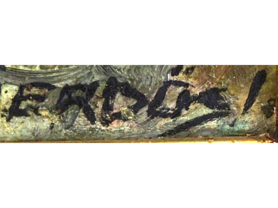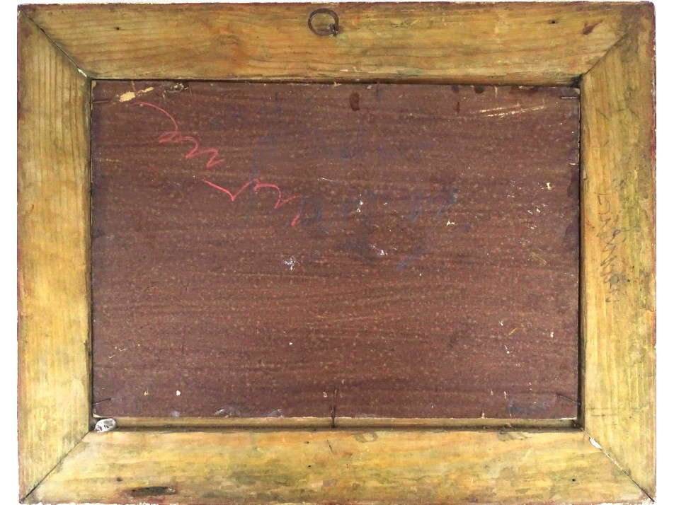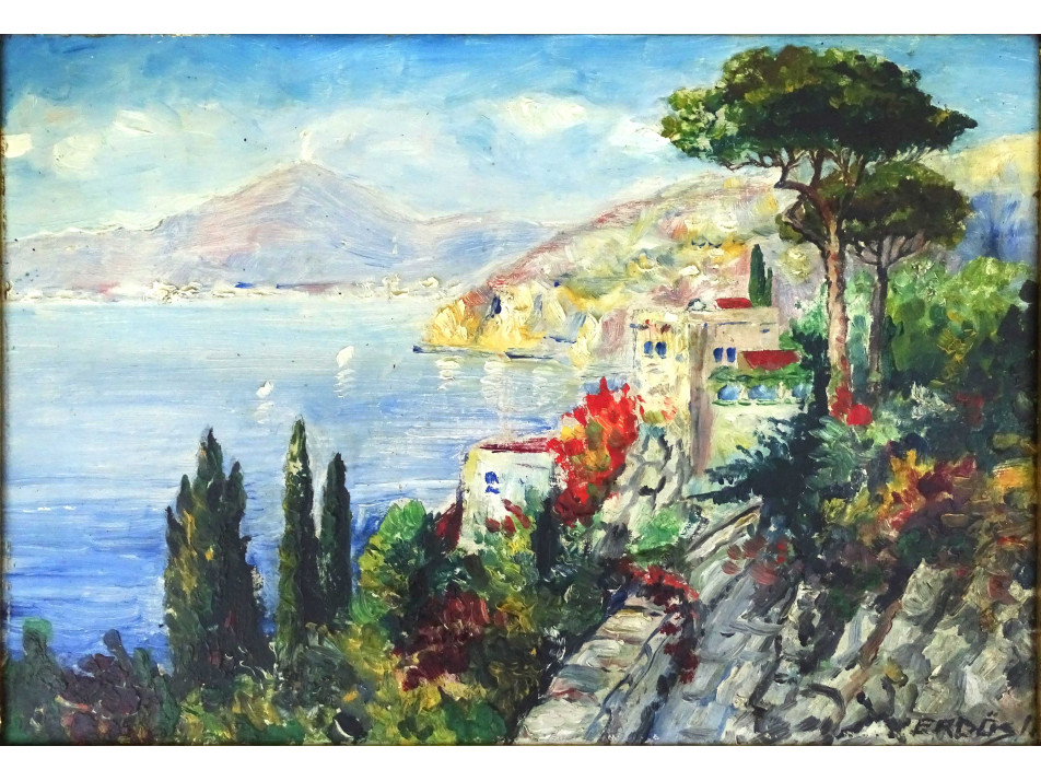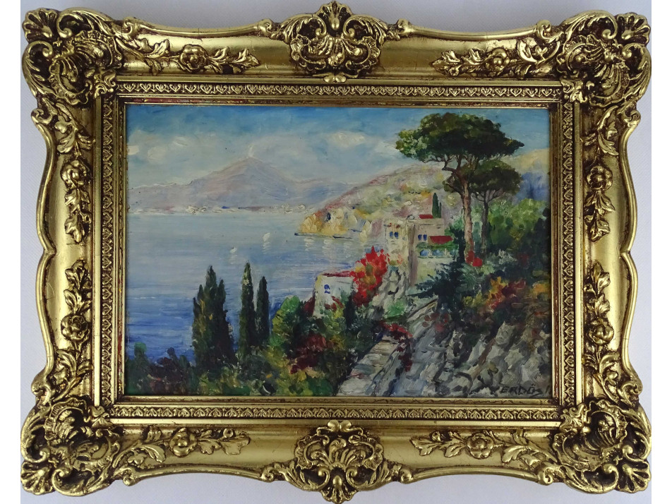 Régi, mediterrán tengerparti tájat ábrázoló olaj karton festmény, hibátlan állapotú, aranyozott blondel keretben. Akasztási lehetőséggel rendelkezik.