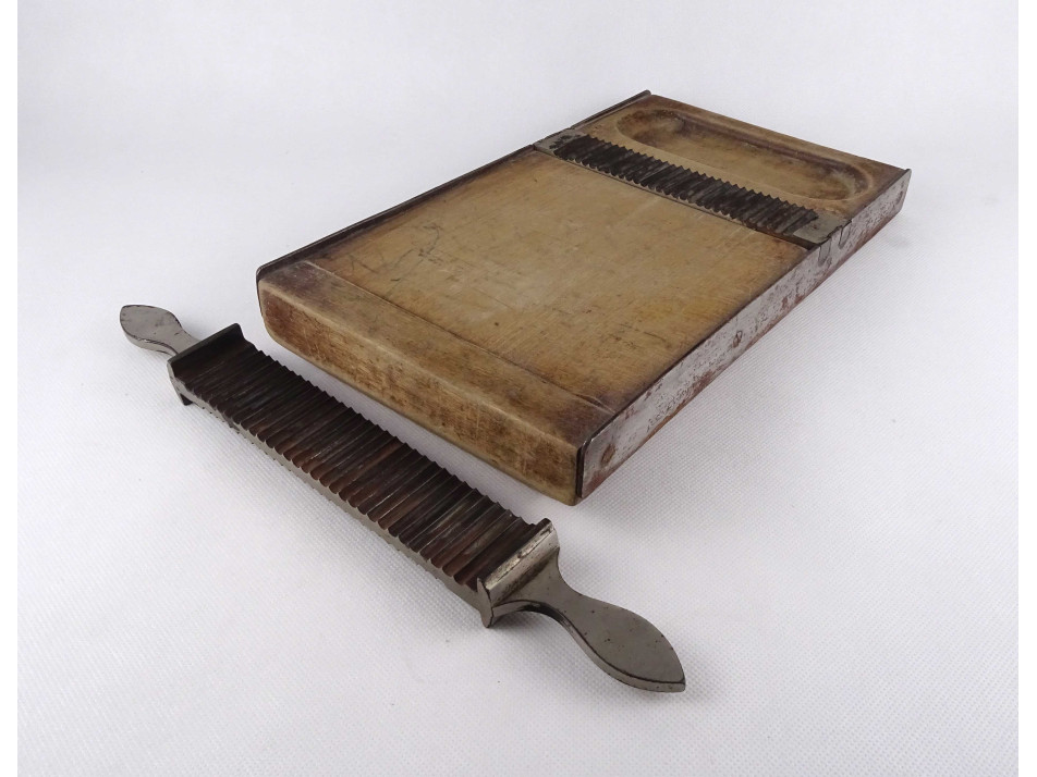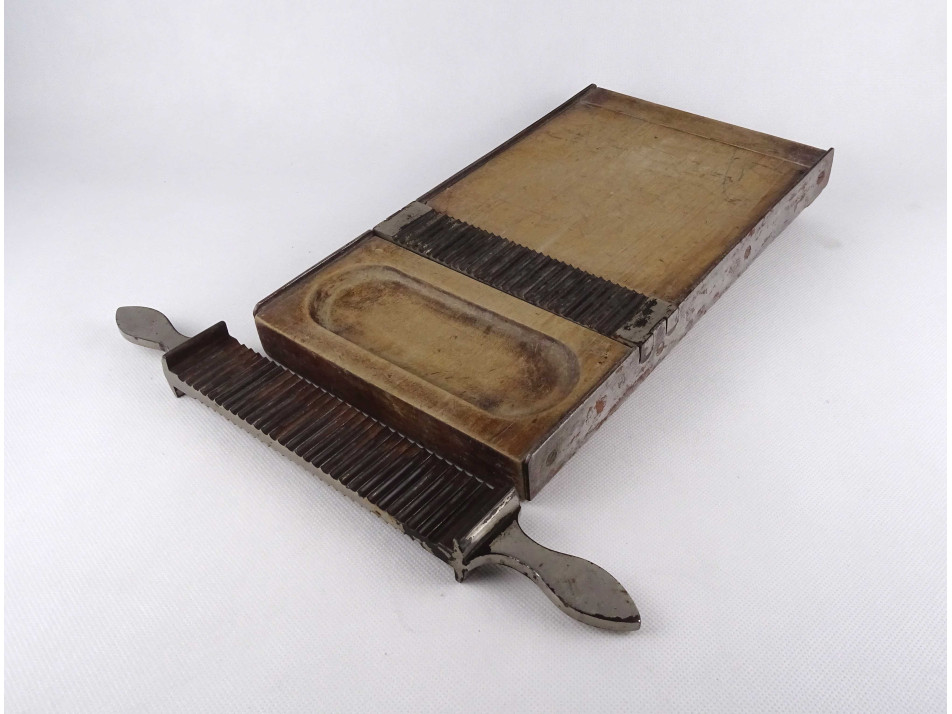 Antik, szép állapotban megmaradt, fa és fém szerkezetű gyógyszerész pirulakészítő, patikai eszköz. A pirulakészítő léc és a kétoldalas fém betét eredetileg krómozott vagy nikkelezett bevonata kopottas.