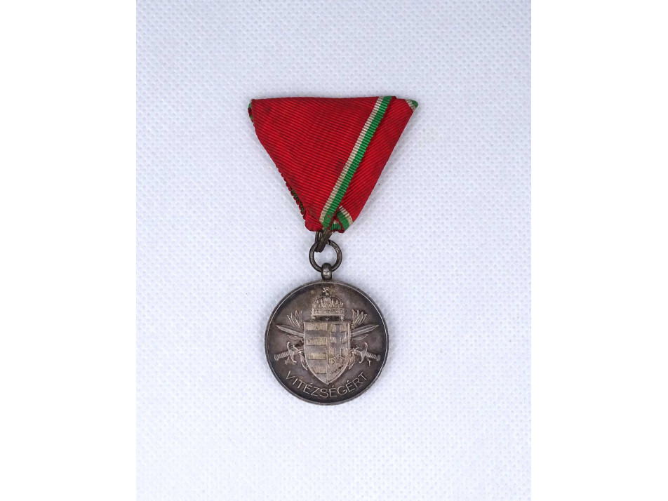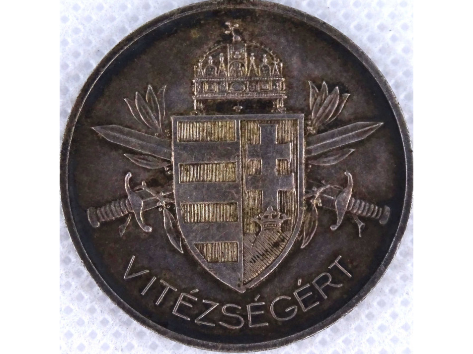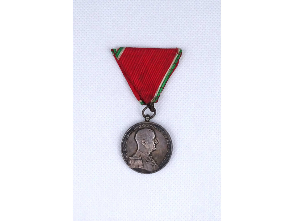 Antik, szép állapotú Horthy Kisezüst Vitézségi Érem. Kétoldalas, jelzett, ezüstözött hadifém érdemérem, katonai kitüntetés. Az érem előlapján a Kormányzó jobb profilt mutató egyenruhás mellképe látható. A körirat: "VITÉZ NAGYBÁNYAI HORTHY MIKLÓS MAGYARORSZÁG KORMÁNYZÓJA". A mellkép alatt BERÁN L. mesterjegy olvasható.