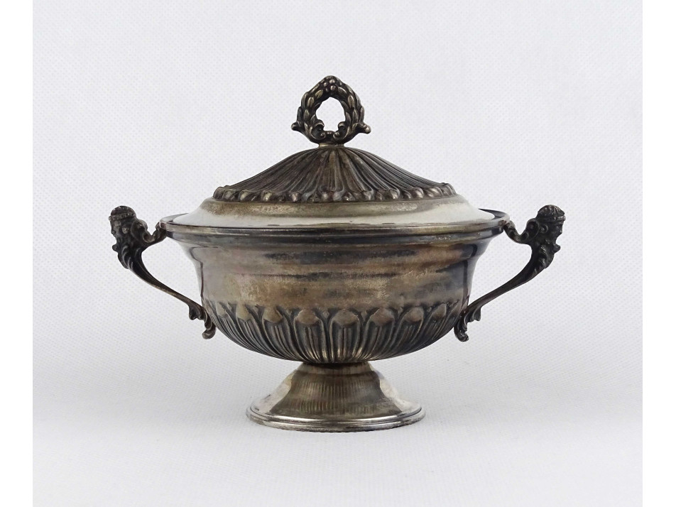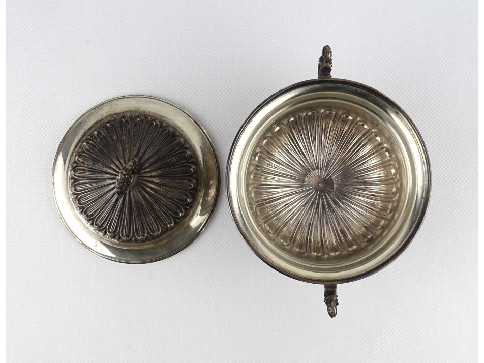Régi, jelzett, 800-as finomságú, antik formavilágú és díszítésű, kerek alakú olasz ezüst kis tál, tálka, fedeles bonbonier.
