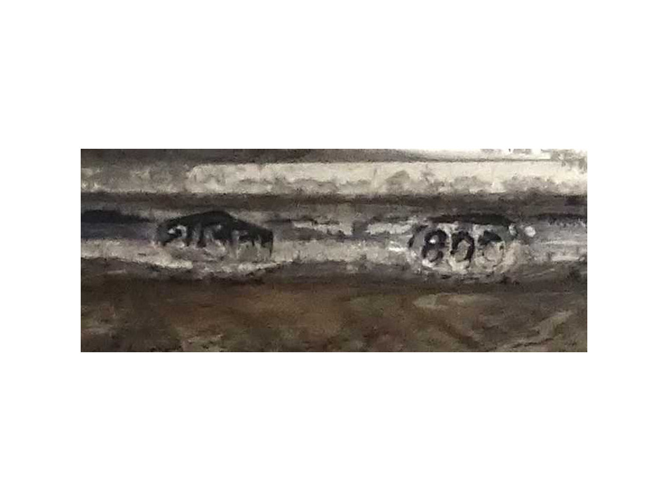 Talpának peremén beütött olasz fémjelek. 800-as finomságjel, mellette tartományjel és gyártói jelzés:
