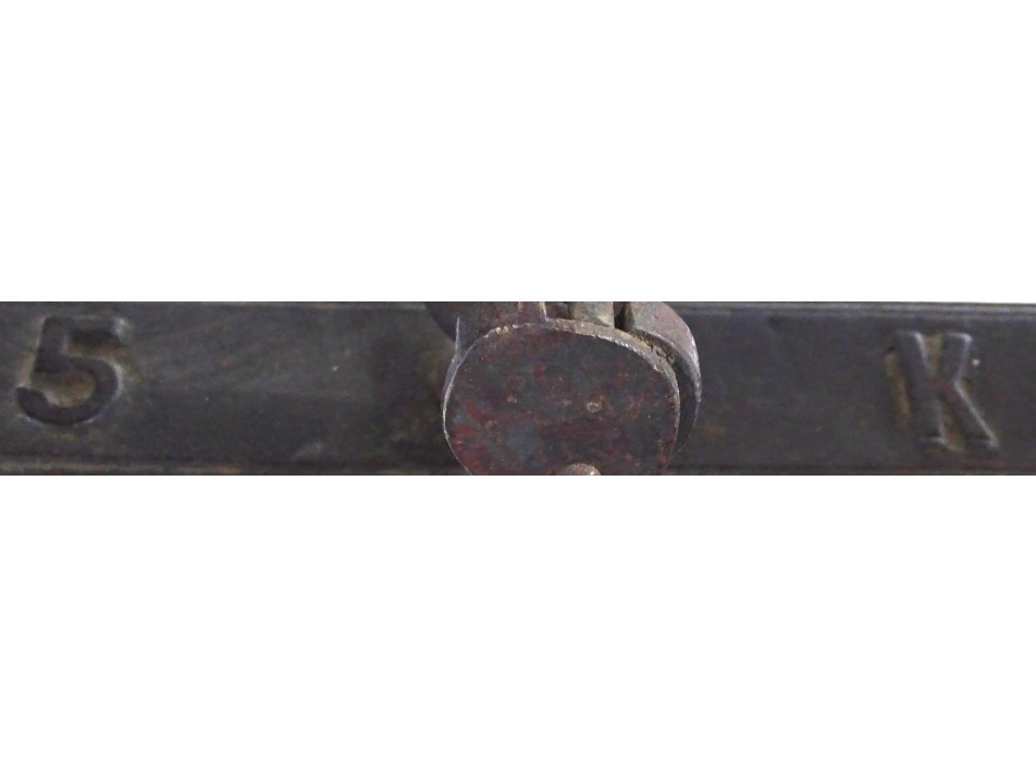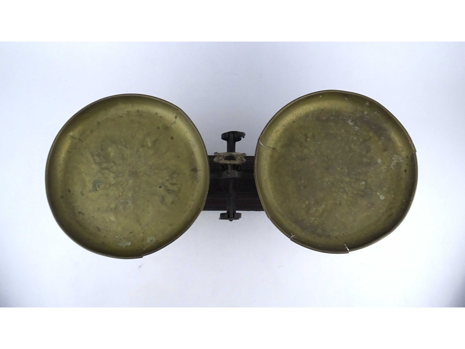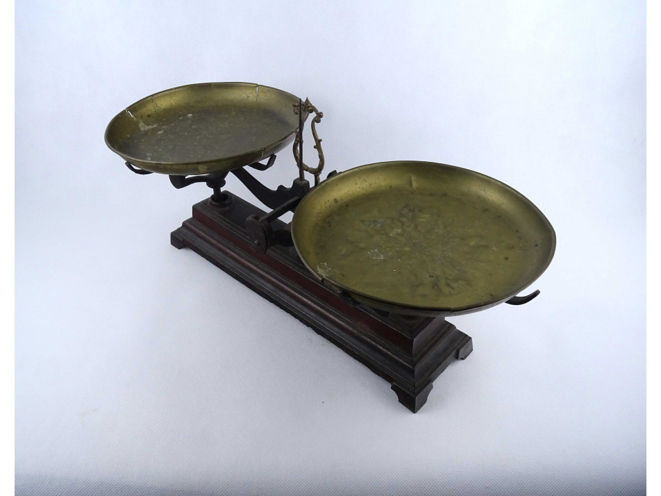 Antik, szép állapotban lévő, működő konyhai, vagy piaci kéttálcás mérleg. A mérleg öntöttvasból, a tálcái rézből készültek. Néhány festékkopás látható rajta, a réztálcák szélei repedezettek.