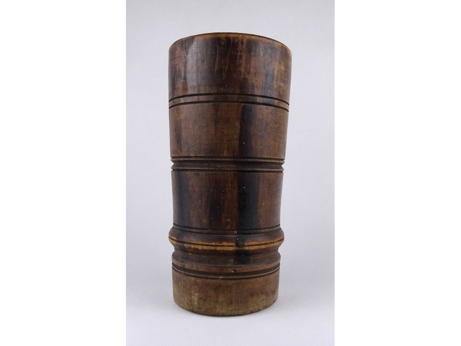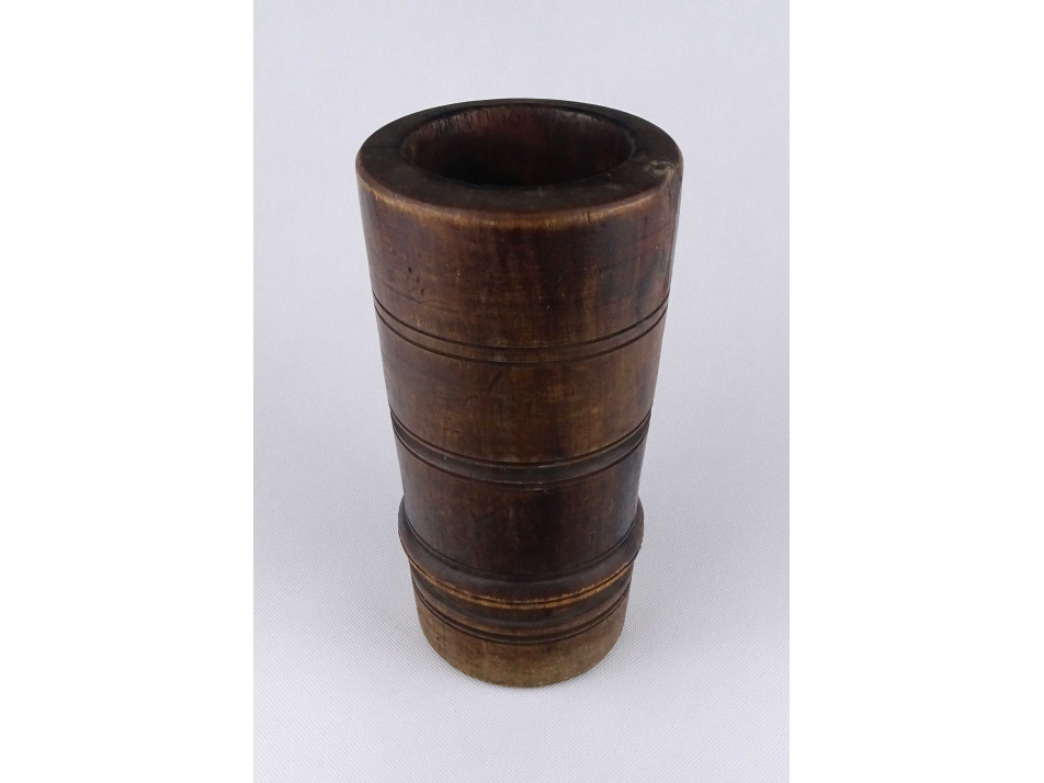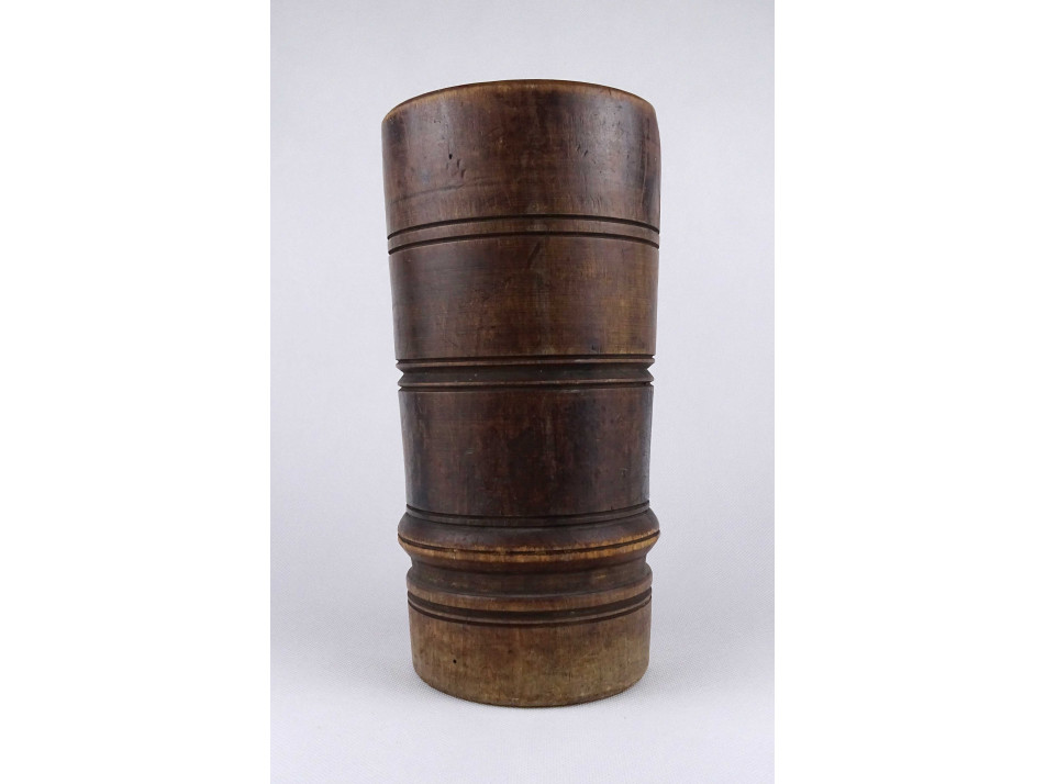 Antik, egy fából faragott vastagfalú, esztergált, sávos mintával díszített mozsár, törő nélkül.