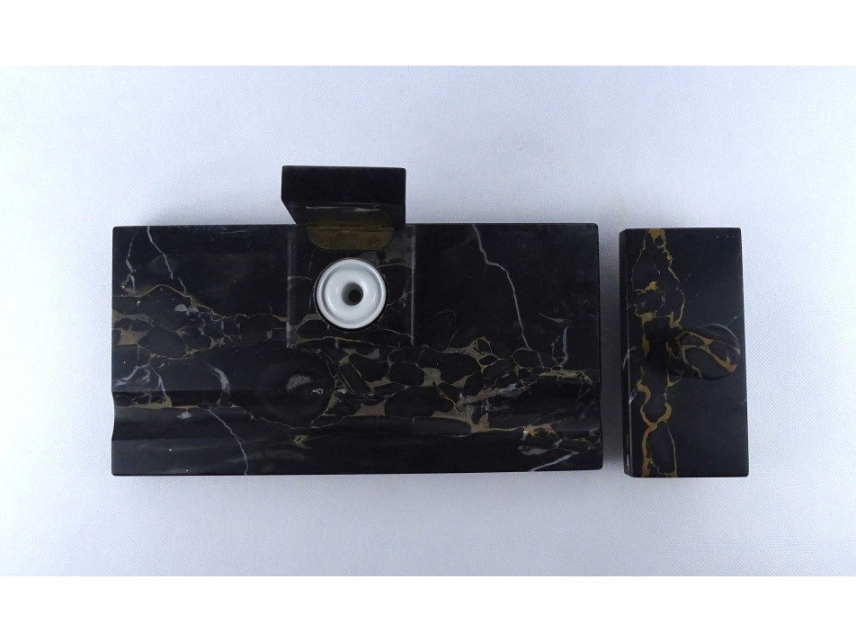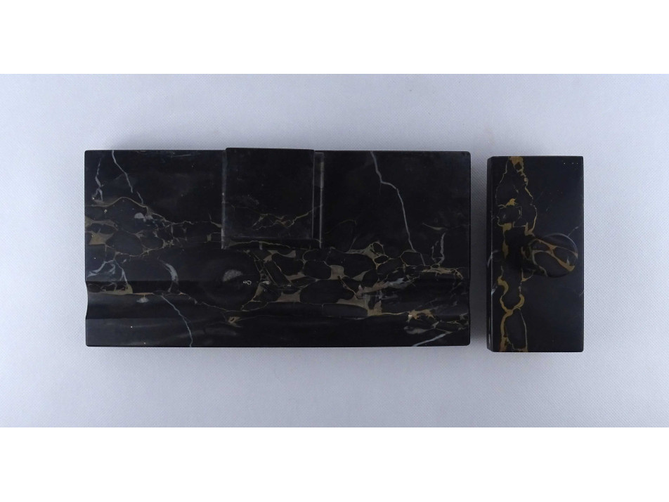 Régi nagyméretű, téglalap alakú, sötétszürke színű, márvány íróasztali készlet, tintatartó, kalamáris és tapper. Rajta egyállásos fedeles tintatartó hiánytalan ép porcelán betéttel.