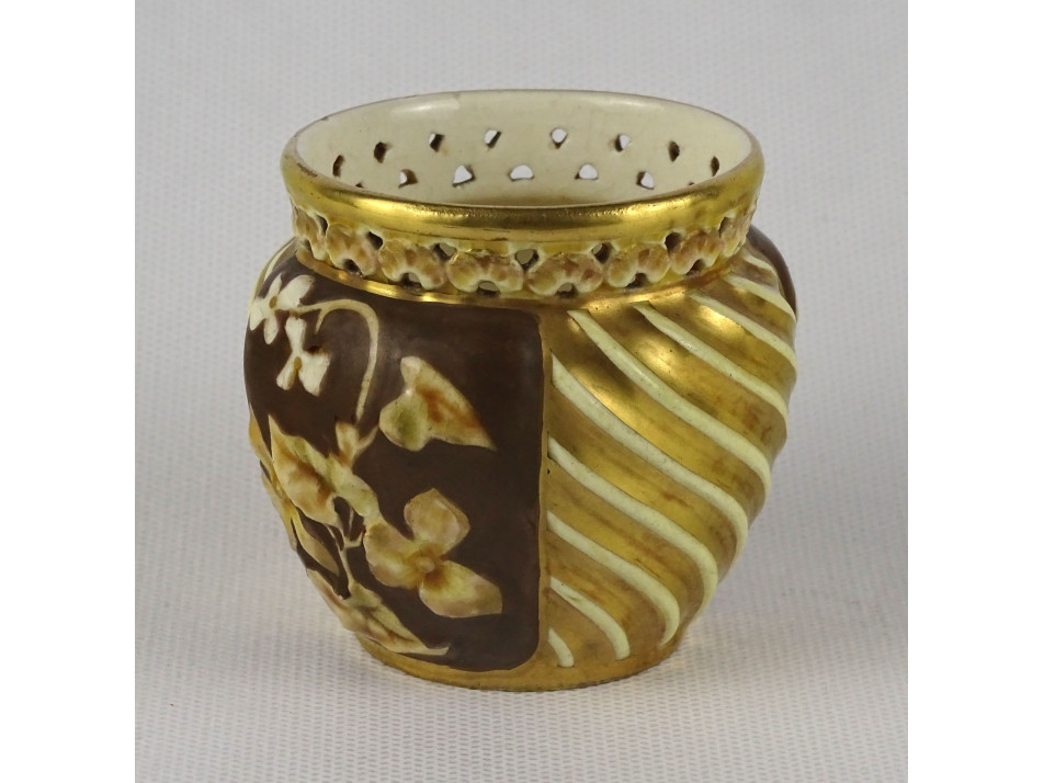 Antik, aranyozott, virágmintás áttört Zsolnay majolika váza vagy kaspó.