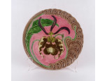 Régi nagy méretű, hibátlan állapotú, falra akasztási lehetőséggel rendelkező, vajszínű majolika Schütz fali tál, nagyon szép, színes virág díszítéssel.