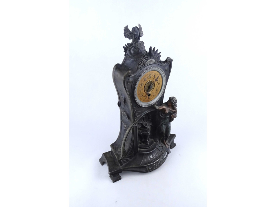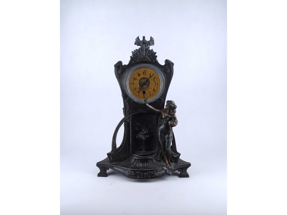 Antik szecessziós ón női szoborral díszített kandallóóra 42.5 cm