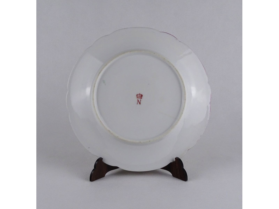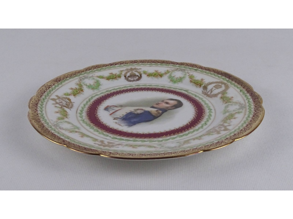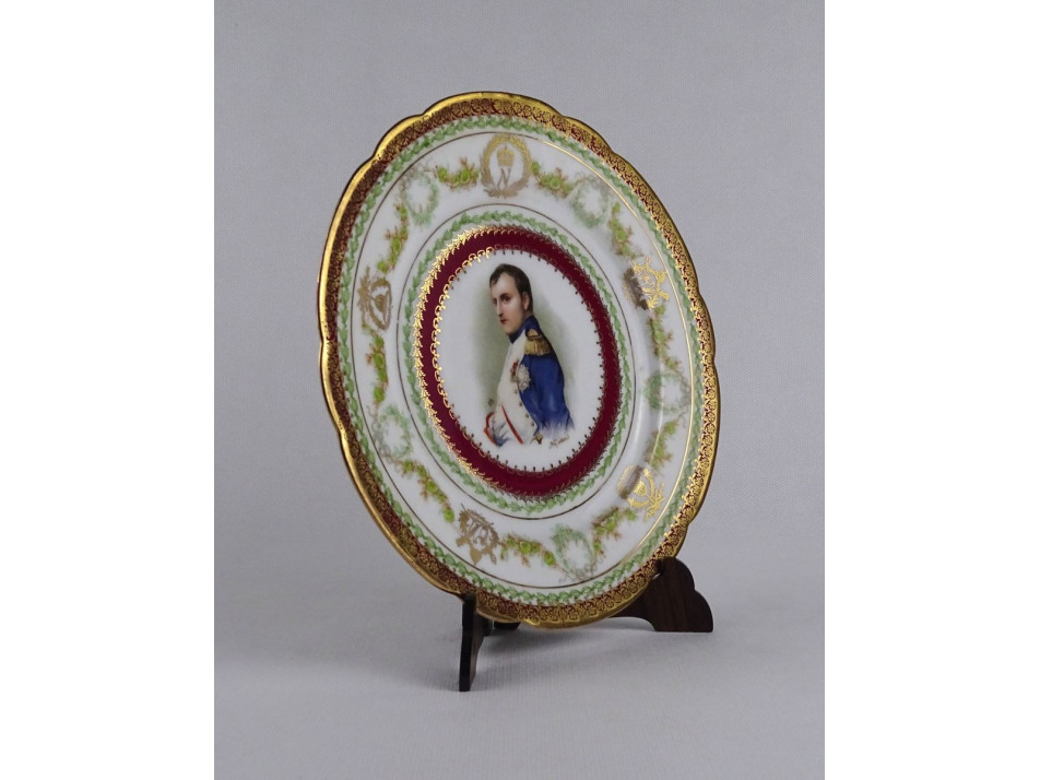 Gyönyörű, gazdagon aranyozott jelzett porcelán tányér, dísztányér. Közepén férfi portré, Napóleon portré. A tányér peremén aranyozott babérkoszorús koronás díszítések láthatók. A táynéron hajszálrepedés található.