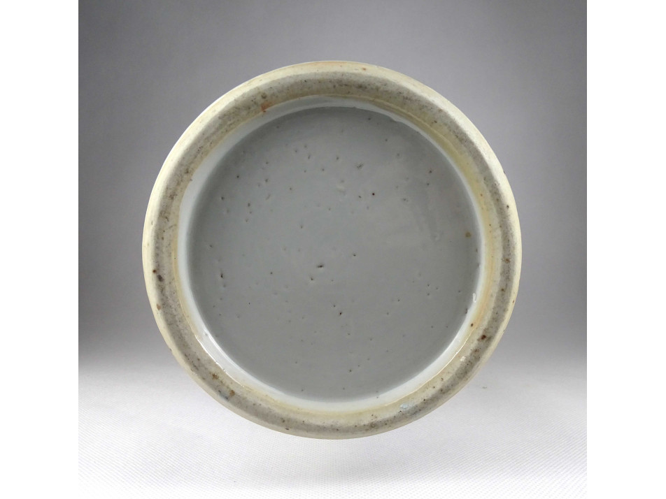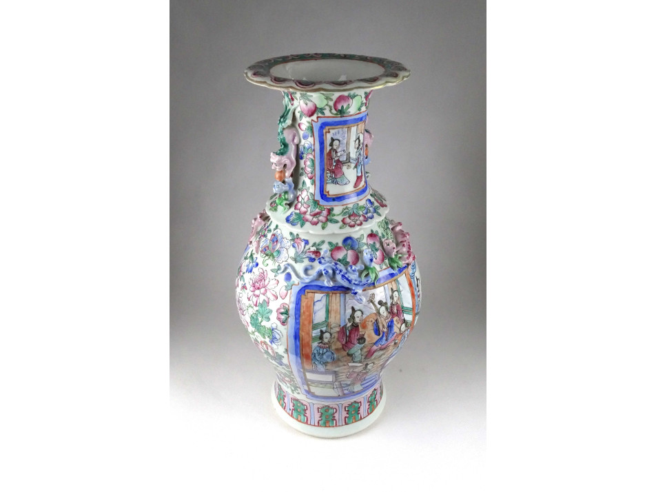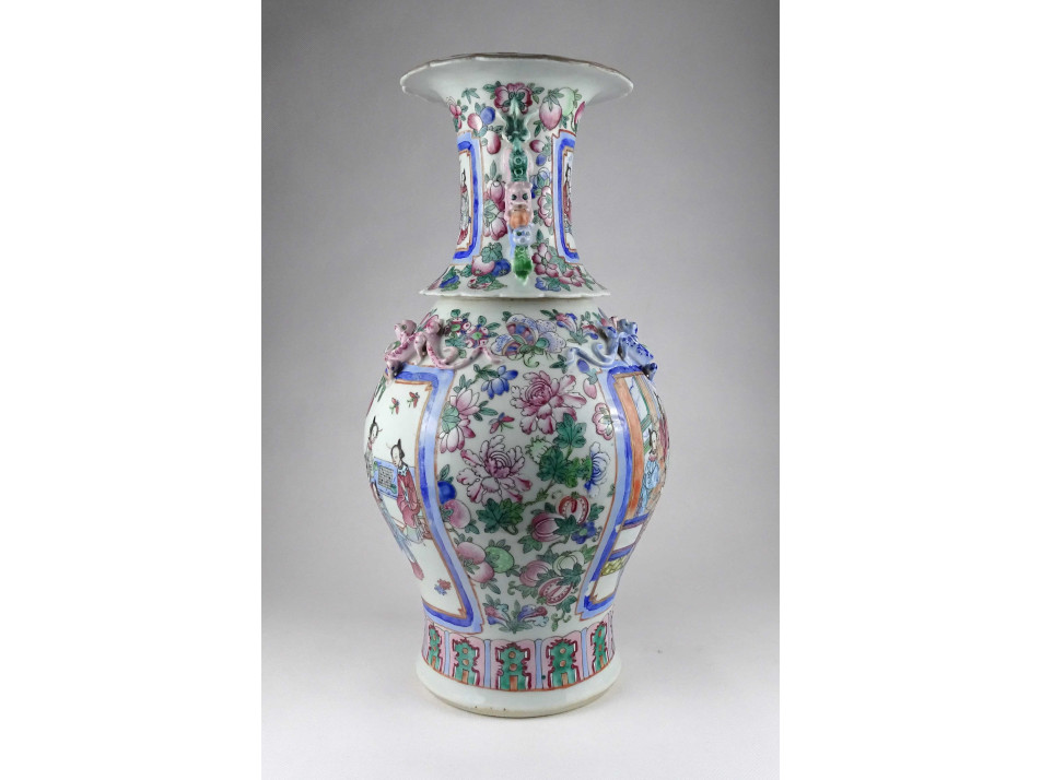 Antik, nagyméretű, plasztikus állatfigurákkal és kézi festéssel díszített, kínai porcelán díszváza, padló váza, oldalán sokalakos jelenetekkel és aprólékos virágmintákkal. Vastag porcelán, fajansz tárgy. A felső pereme szakszerűen javított, restaurált.